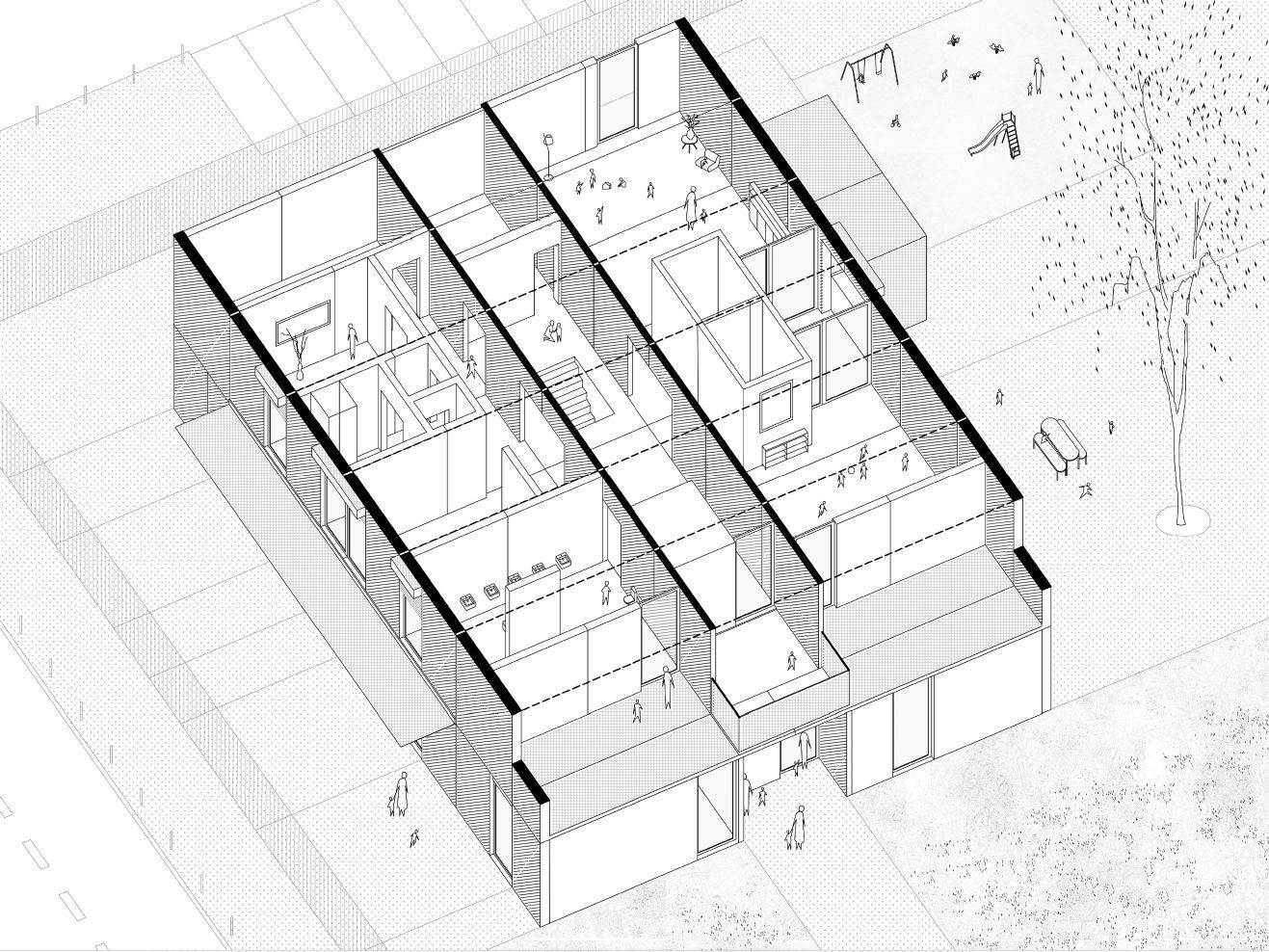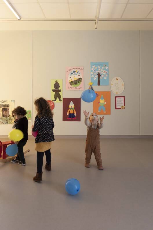 托儿所分布在两层楼,使其占地面积更紧凑,以解决地块空间有限的问题(所有地块都位于综合城区),并最大限度地扩大休闲区的外部空间。基本服务区(厨房、行政区、洗衣房等)位于一楼,而儿童活动室则分布在两层。所有这些房间都可以直接通往室外——在一楼,通往操场;在楼上,穿过露台。