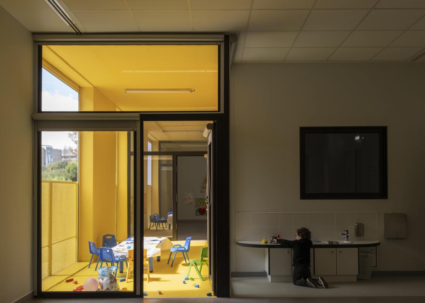 流通空间呈直线状,便于建筑内的用户定位和所有区域之间的可见性,提高了功能性和安全性。室外空间被设计为室内活动的延伸。建议使用一些防滑铺装区域,以便可以使用轮式玩具。我们还考虑了与孩子们一起进行户外活动的花园区域的存在。大部分外表面的植被覆盖有助于土壤渗透性。植物和树种的选择是基于适应气候、低需水量和排除可能引起过敏问题的物种的标准。
