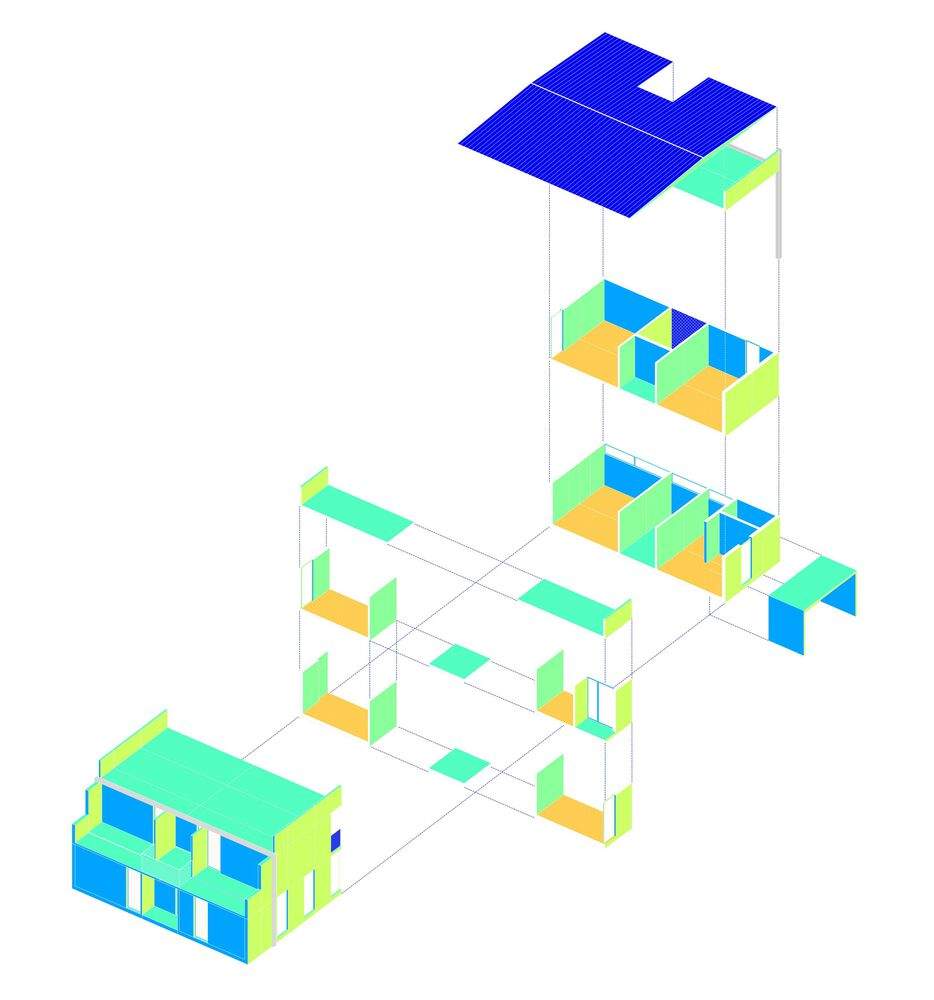 解决方案的标准化自然意味着四所幼儿园之间的正式类比。建筑的形象源于模块化建筑系统所带来的潜力和局限性。从外部看,可以清楚地解读建筑物的构造——接缝是可见的,人们可以分辨出每个模块以及它们的排列和支撑方式。这4个托儿所具有相似的有机和功能分布:两组重叠的“U形”模块,容纳各种隔间,以及它们之间的中央走廊,所有水平和垂直循环都在这里进行(走廊、楼梯间和电梯)。供暖、通风和空调基础设施的主要部分也位于这些中央走廊线内,通过相邻的侧墙到达各个隔间。