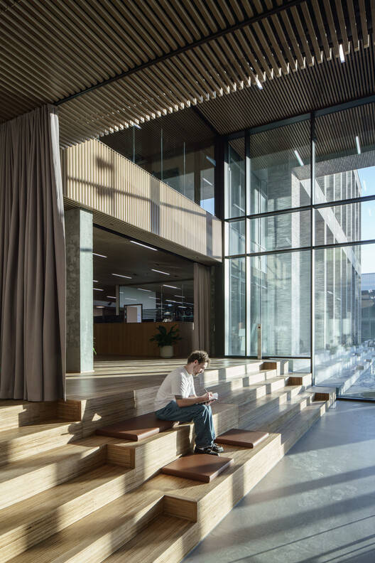 环境与人文的和谐共处:在Incuba Next的设计中,建筑师们特别注重建筑与周围环境的和谐共处。建筑体积被巧妙地划分为更小的部分,以适应周围环境和现有建筑群的规模,避免了对原有景观的破坏。立面采用轻质科伦巴砖,既强调了建筑的坚固性和触感,又与周围环境相得益彰。底层设计开放、活跃而温馨,与现有Incuba场所无缝融合,为人们提供了一个舒适的工作和交流空间。此外,建筑前方的公共广场和景观屋顶露台不仅增强了社区特色,还为人们提供了休闲和思考的空间,实现了人与自然、建筑与环境的和谐共处。