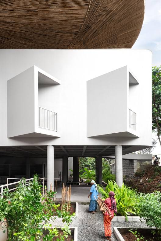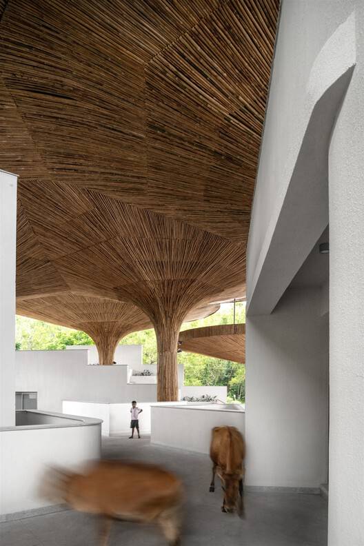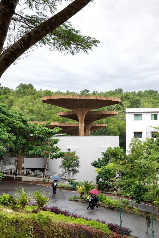 安加拉作为一个多孔的连接中心,覆盖露台对于应对当地气候至关重要。我们从印度瓦拉纳西的ghatscapes中常见的竹子“Chhatris”中汲取灵感。这些传统的遮阳伞象征着各种商业、宗教和娱乐活动的起点。除了提供庇护所,chhatris不仅是建筑元素,也是当地工匠文化连续性的象征。