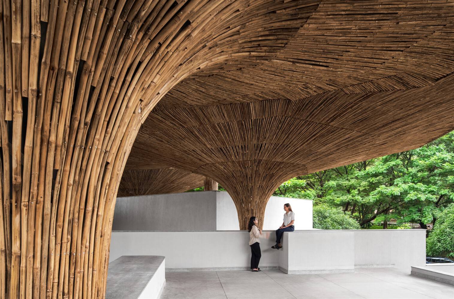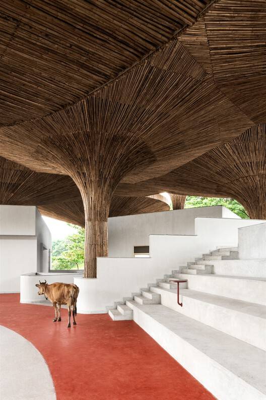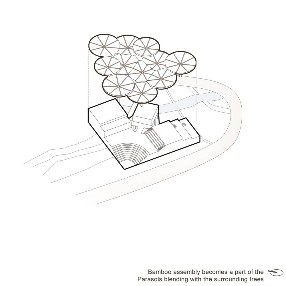 With Angala serving as a porous connectivity hub, covering the terrace became essential in addressing the local climate. We drew inspiration from the "Chhatris" of bamboo, commonly seen in the ghatscapes of Varanasi, India. These traditional sunshades signify the starting point for various commercial, religious, and recreational activities. Beyond providing shelter, chhatris stand not only as architectural elements but also as symbols of cultural continuity for local artisans.