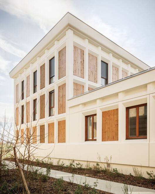 新建筑扩建的立面采用木框架墙技术建造,覆盖着垂直板条的覆层。这个由实木制成的框架与现有建筑的混凝土框架相呼应。