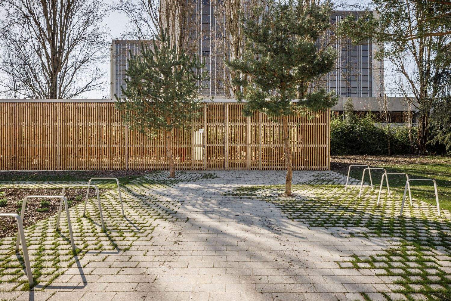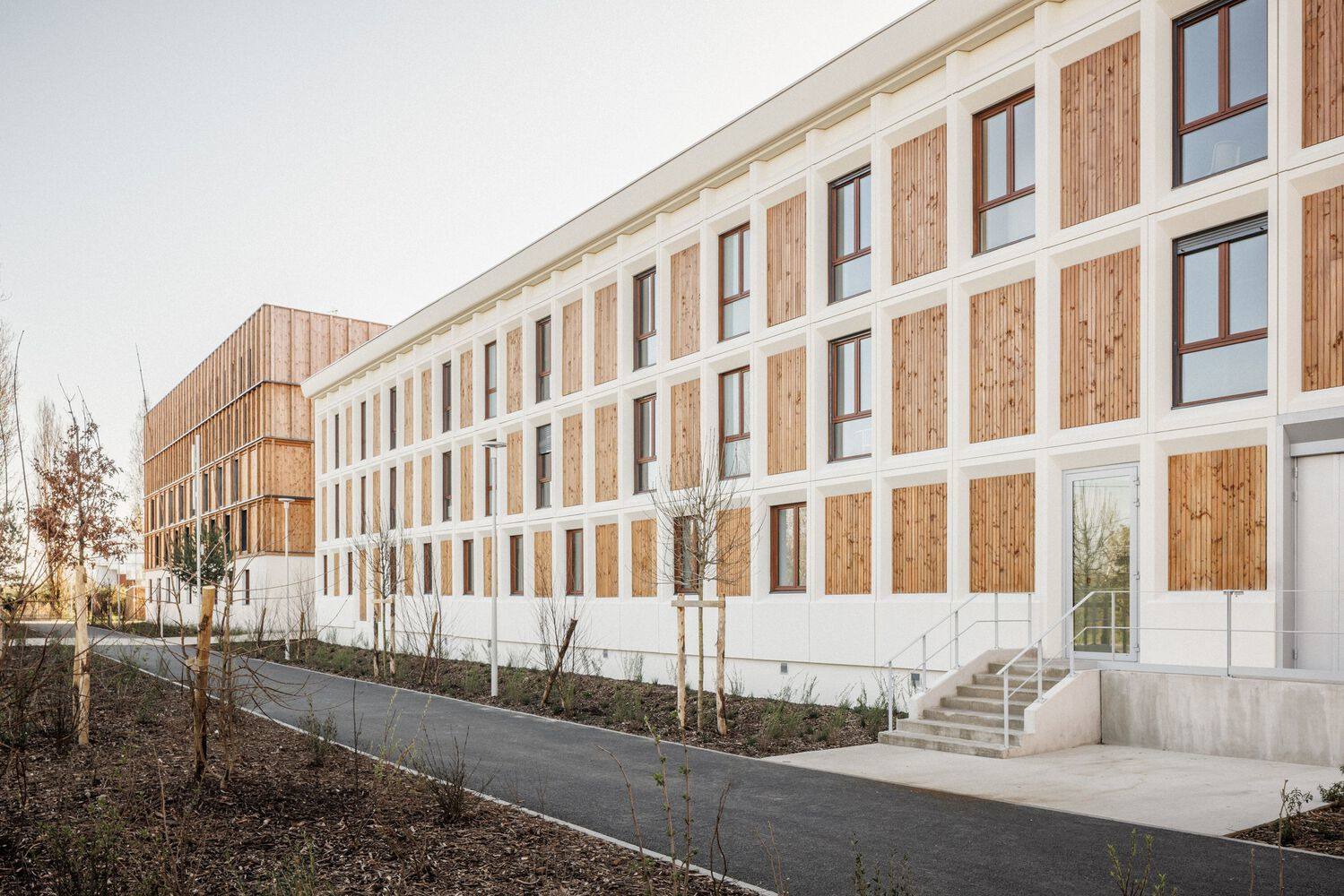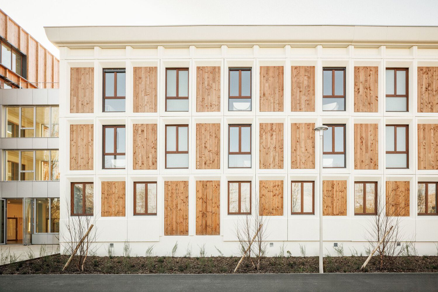 The facades of the new building extension are built using the timber frame wall technique, covered with cladding with vertical battens. This frame made of solid wood pieces echoes the concrete frame of the existing building.