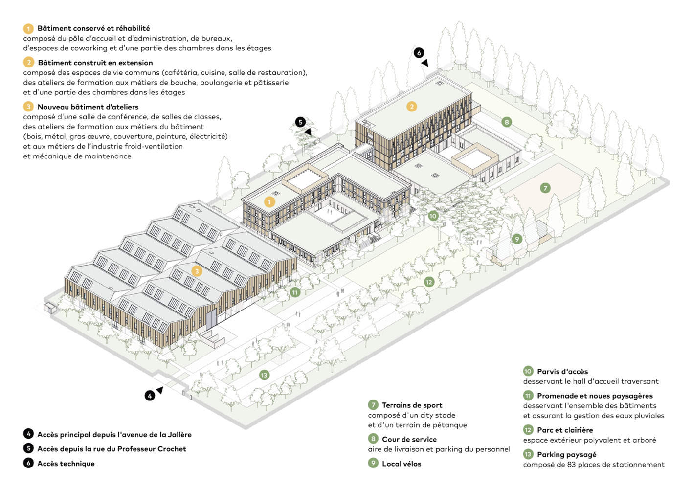 The landscaping of the two hectares of the site allows the creation of vegetable gardens, a city stadium, a wooded park, as well as wooded walks leading to the entrance square.
