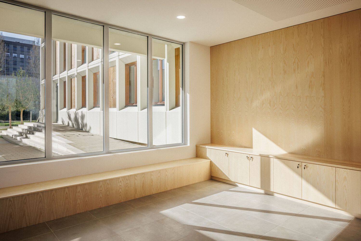 The new extension replaces the southern part, and includes on the ground floor the common living spaces (cafeteria, kitchen, dining room) and the training workshops for the food, bakery and pastry trades. The rest of the rooms are located on the four upper floors, connected to the existing building by glass walkways above the hall.