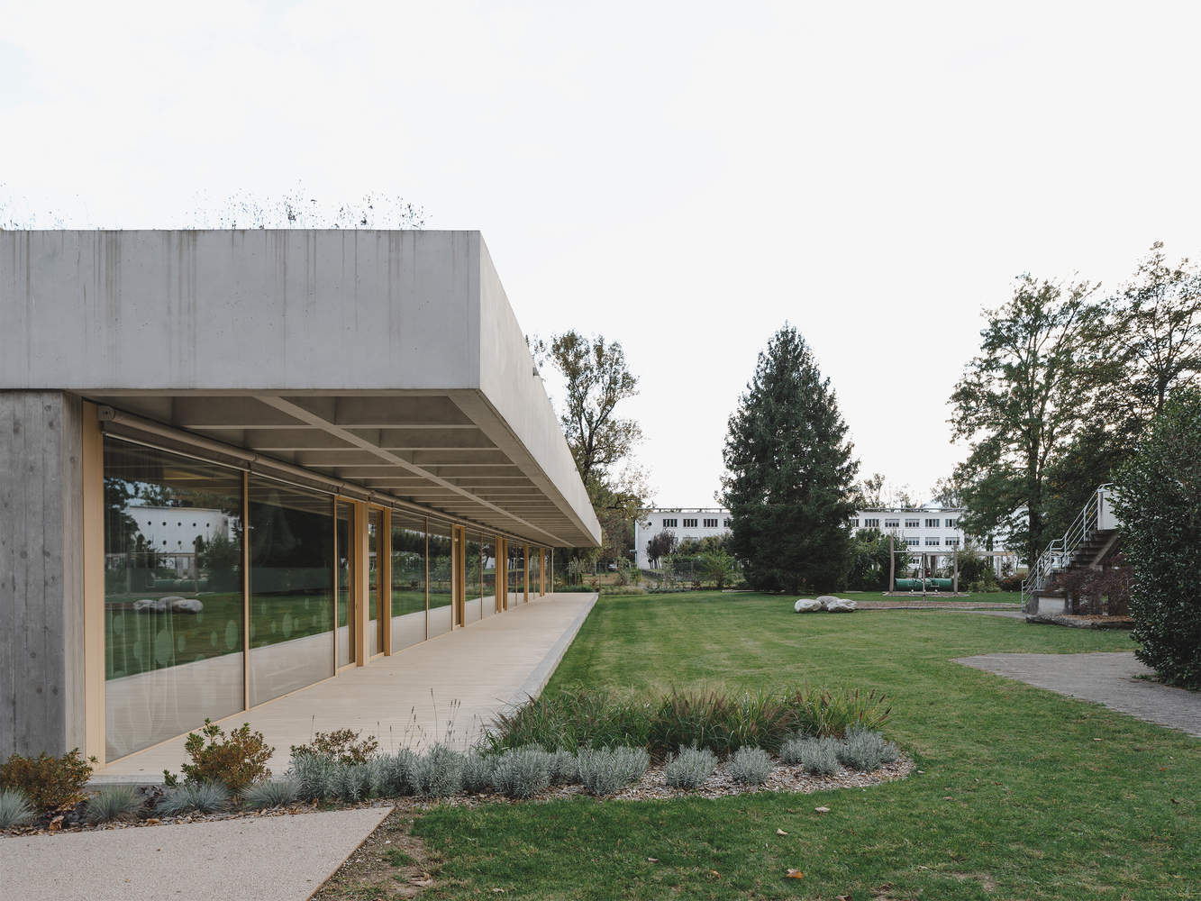 The design draws inspiration from the simplicity and modularity of the original architecture, defined by a single ground floor scaled to children's proportions. The new sections echo these materials and dimensions while incorporating a distinctive large coffered concrete roof. This unifying element protects internal and external functions and ensures a seamless transition between indoor and outdoor spaces. The modular structure, based on a 165x165 cm grid, enables spatial reconfiguration for diverse educational needs, supported by large sliding doors. The vertical load-bearing system, limited to two end walls and internal columns, makes the remaining space fully adaptable, enhancing the pavilion-like nature of the complex. Sustainability was a guiding principle, with materials and techniques chosen to minimize environmental impact. The integration of green spaces, natural ventilation, and abundant daylight reinforces sustainable design principles, earning the Swiss Minergie energy label.