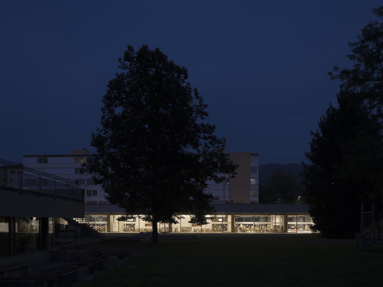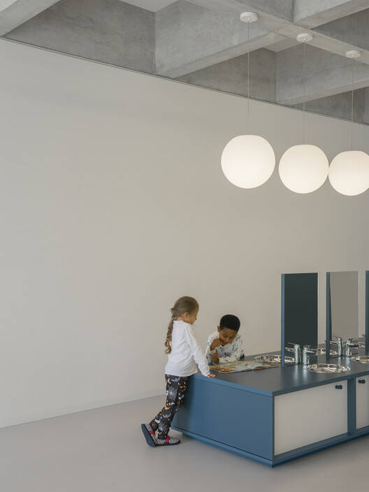 两个新的幼儿园部分,根据上下文原则设计,与建筑师Dolf Schnebli(1973)的原始建筑的有机建筑语言无缝融合。然而,这种干预确立了自己的身份,与现有结构进行了连贯的对话,丰富了其建筑价值。这项工作的核心重点是创造灵活、开放的空间,促进儿童、教师和家庭之间的互动,增强社区意识。空间安排支持在正式和非正式学习环境中的共享活动和社交时刻。公共区域、战略交汇点和多功能区鼓励合作,形成一个充满活力和包容性的教育环境。