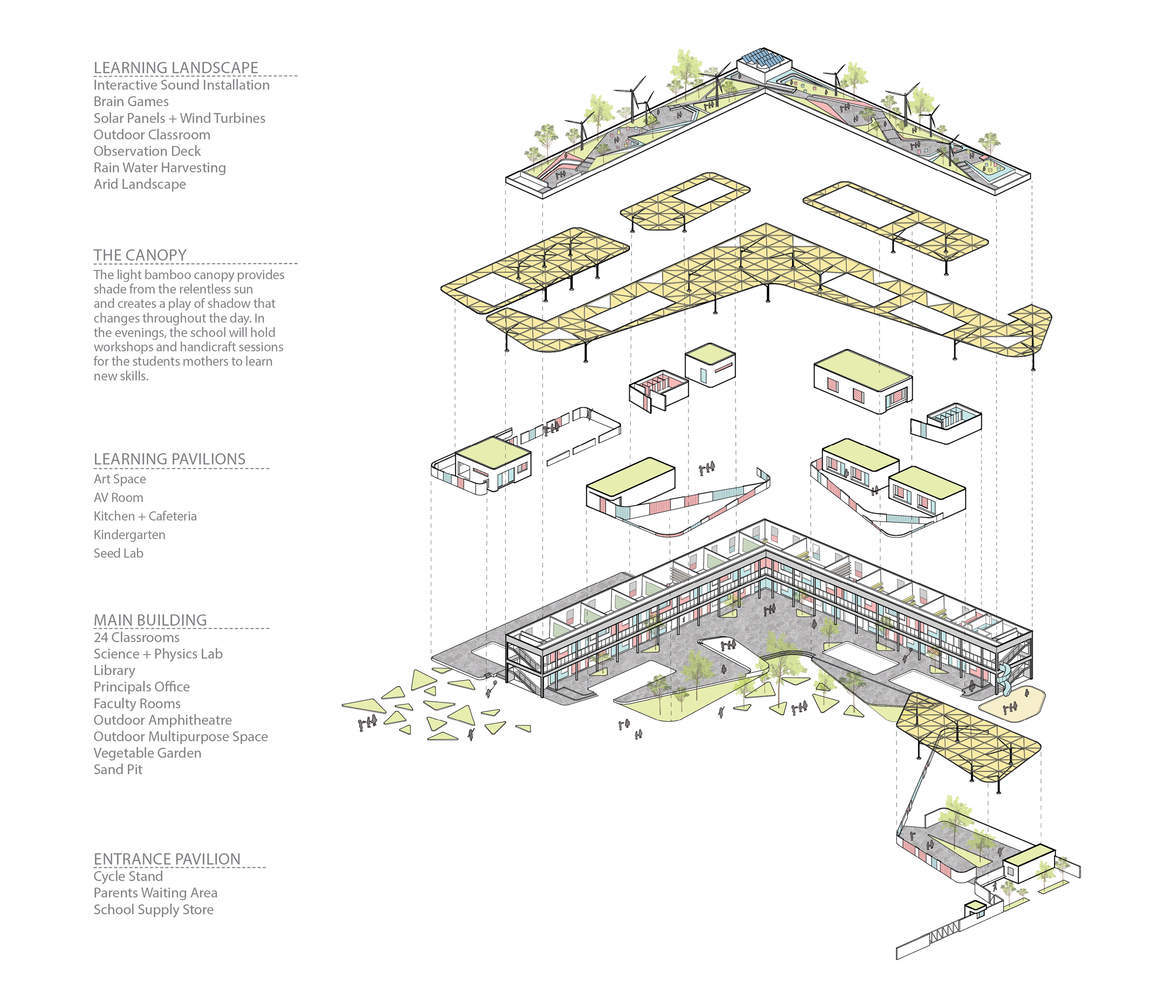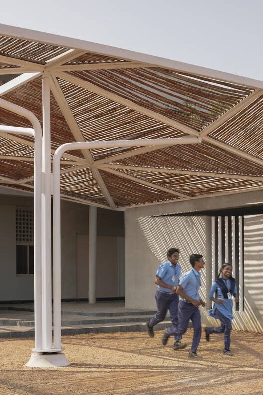 内部布局经过重新设计,创建了24个教室、2个教员休息室、3个实验室和2个多功能图书馆。这些额外的项目不是通过重型基础设施进行扩建,而是被设想为独立的展馆,包括厨房、自助餐厅、视听厅、幼儿园、美术室、浴室和自行车停车场。室外区域以前在温度超过43摄氏度(109华氏度)的高温下无法使用,现在被一个宽敞的竹棚覆盖着,竹棚由一个轻质的分支金属框架支撑,将展馆与现有结构连接起来。12000根15英尺长的竹竿是通过政府林业计划在当地采购的,并在现场风干,以确保长期耐用性和气候适应性。有盖区域用于全校聚会和户外教学活动的多功能空间,随着阴影图案随太阳移动,这些区域全天都在变化。