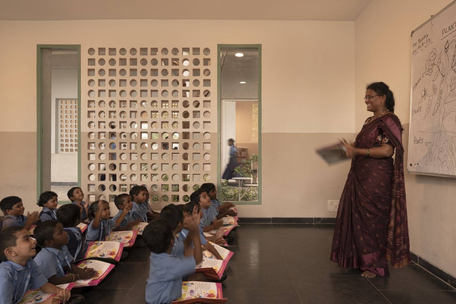 Text description provided by the architects. Located in rural Andhra Pradesh, a hot and dry region in Southern India, our proposal re-envisions a fifteen-year-old "L" shaped school building into a vibrant and empowering learning environment for the children of cement factory workers. The existing structure, sited in the rear corner of a barren two-acre property, was structurally sound but in semi-disrepair, with no shade other than a few trees along the site wall for the students to escape the intense sun during afternoon breaks. The interior spaces, with little natural light and ventilation, were divided into sixteen oversized classrooms, a library that doubled as a faculty room, two labs and external bathrooms that were difficult for the children to access due to distance and a circuitous path. The client brief, given by the Penna Foundation, was to create a prototype design that could be implemented at other regional cement factories, using well-designed spaces and extracurricular programs as an attractor for teachers who otherwise do not consider relocating to the remote area.