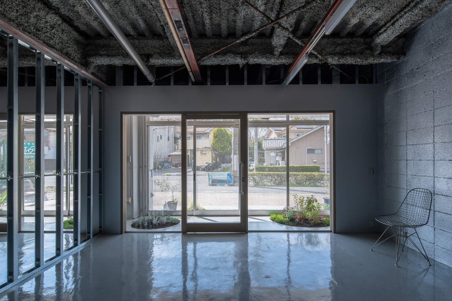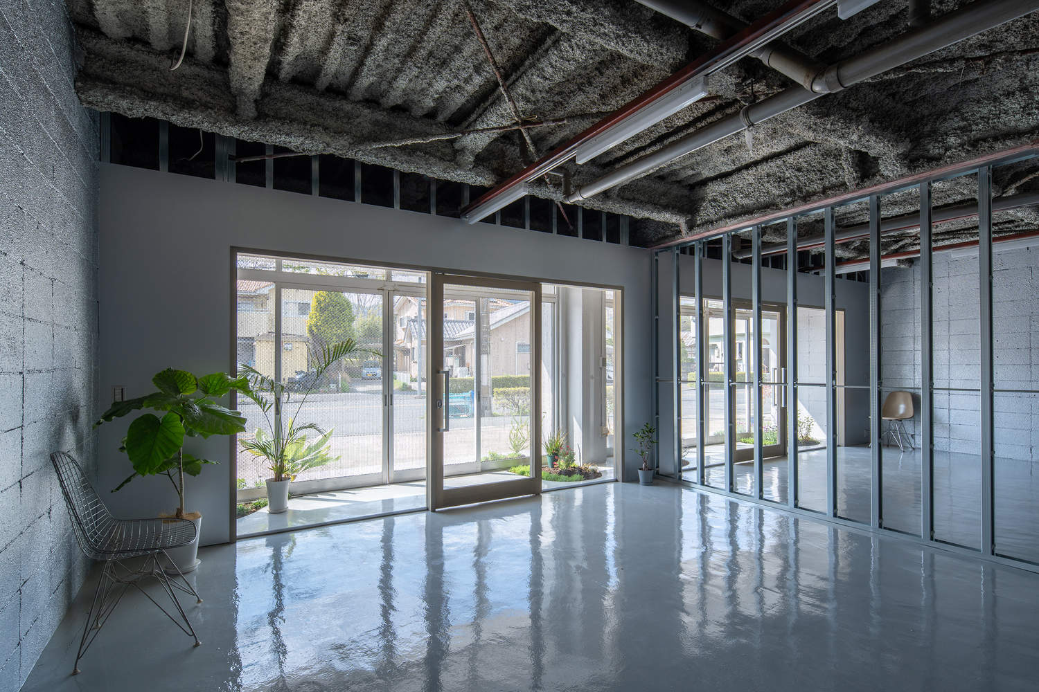 Interior: The interior of vacant store 1-2 has been renovated to the bare minimum. To accommodate the flexibility of renters, the stud wall foundation is left exposed. In contrast to the exterior, the interior design is left up to the tenant, which increases their motivation to move in. The room is also divided into two by a central pillar, with a toilet at the back of each. The silver walls and glossy floor paint deliver natural light to the large space, creating an open space that does not give the impression of low ceilings.