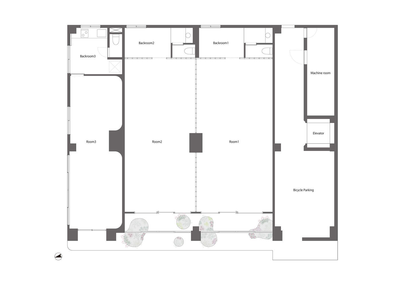 内部:空置店铺1-2的内部已翻修至最低限度。为了适应租户的灵活性,立柱墙基础是暴露的。与外部相比,室内设计由租户决定,这增加了他们搬进来的动力。房间也被一根中央支柱分为两部分,每部分后面都有一个厕所。银色的墙壁和光滑的地板涂料为大空间提供了自然光,创造了一个不会给人低天花板印象的开放空间。
