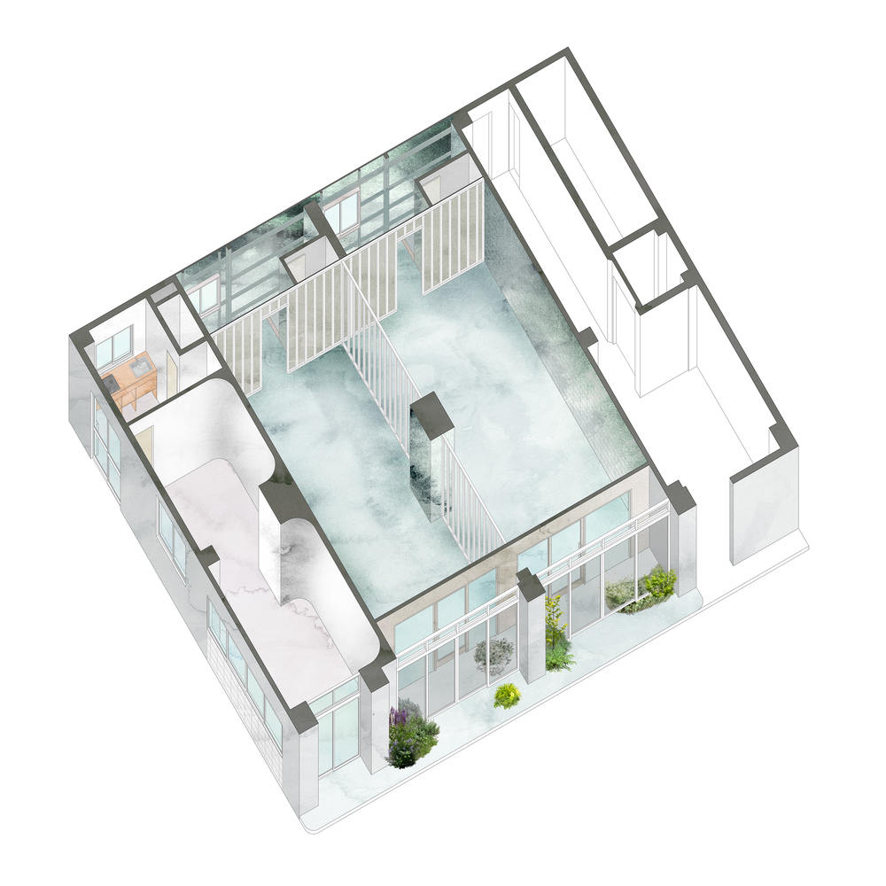 空置的商店3从东到西狭长。虽然北侧有许多开口,但南侧被隔墙隔开,一堵巨大的混凝土砌块墙从房间的中心伸出。我们的目标是积极地重新诠释南北之间的对比,创造一个夹在具体性(动态的外部)和抽象性(静态的内部)之间的模糊空间。通过增加房间的抽象层次,强调了通过开口可见的动态户外风景,而柔软的墙壁则温柔地包围着使用者。