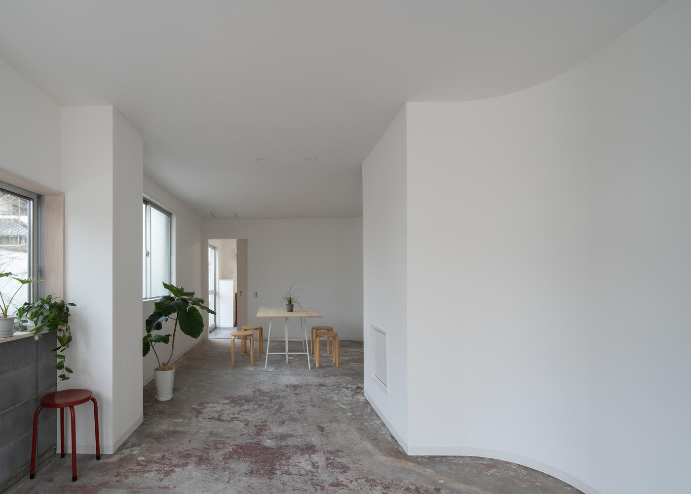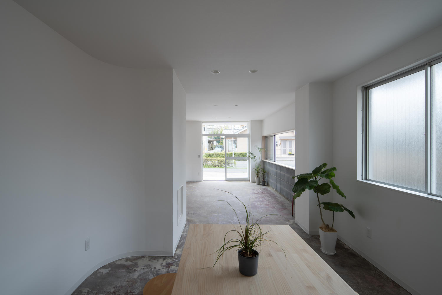 Vacant store 3 is long and narrow from east to west. While there are numerous openings on the north side, the south side is closed off by a partition wall, with a large concrete block wall protruding from the center of the room. We aimed to positively reinterpret the contrast between the north and south and create an ambiguous space sandwiched between concreteness (a dynamic exterior) and abstractness (a static interior). By increasing the level of abstraction in the room, the dynamic outdoor scenery visible through the opening is emphasized, while the soft walls gently envelop the users.
