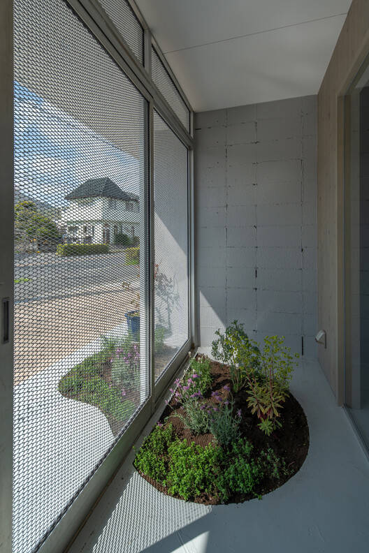Exterior: The existing aluminum sashes on the roadside have had their glass replaced with expanded metal to create a light and transparent facade, and a small garden has been set back between the existing sashes and the exterior wall. By establishing a design code for a building, tenants can prevent chaotic exterior designs, and they can maintain and manage plants, contributing to the streetscape.
