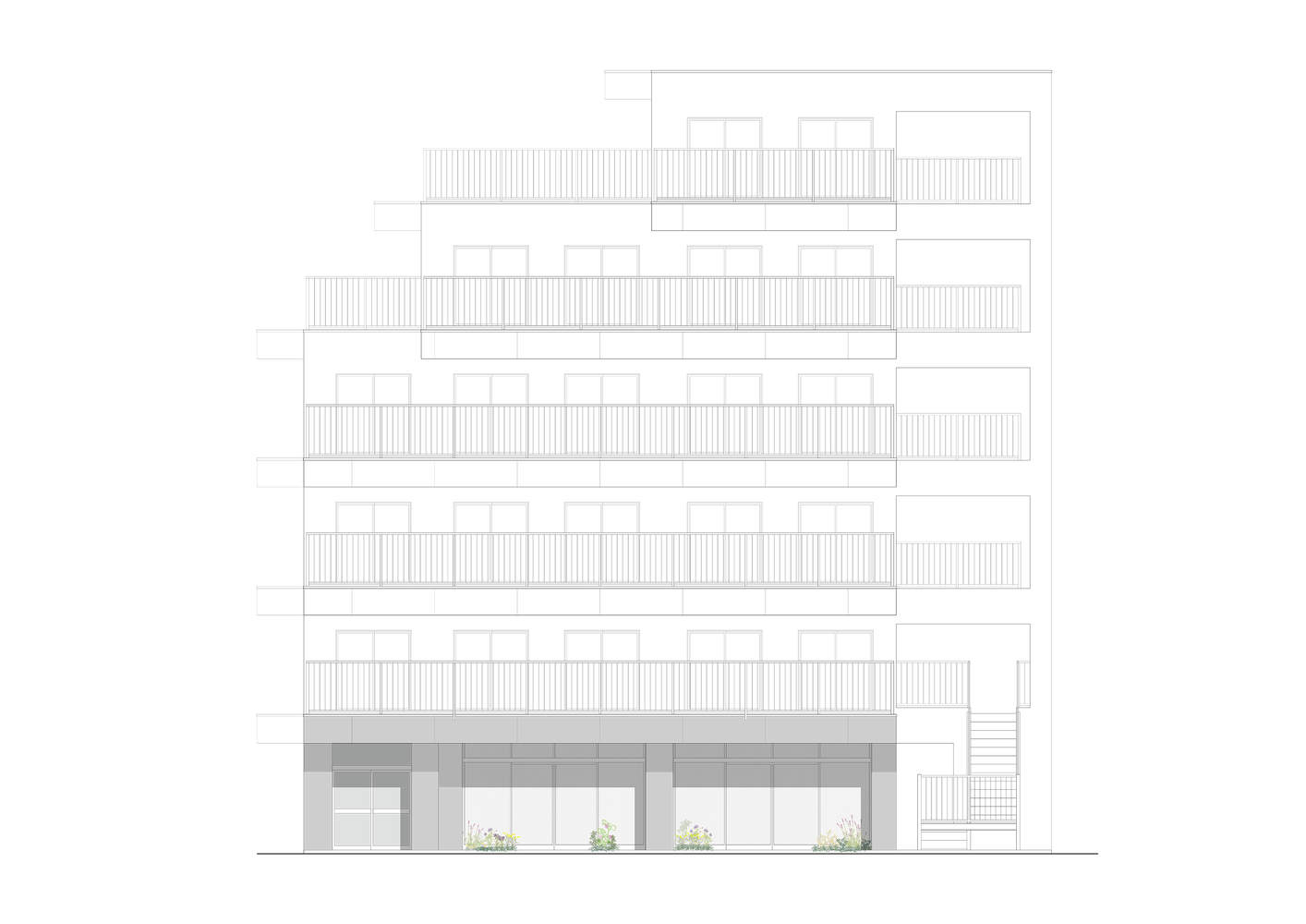 外部:路边现有的铝制窗框已将玻璃替换为金属网,以创造一个轻盈透明的立面,并在现有窗框和外墙之间设置了一个小花园。通过为建筑制定设计规范,租户可以防止混乱的外部设计,他们可以维护和管理植物,为街景做出贡献。