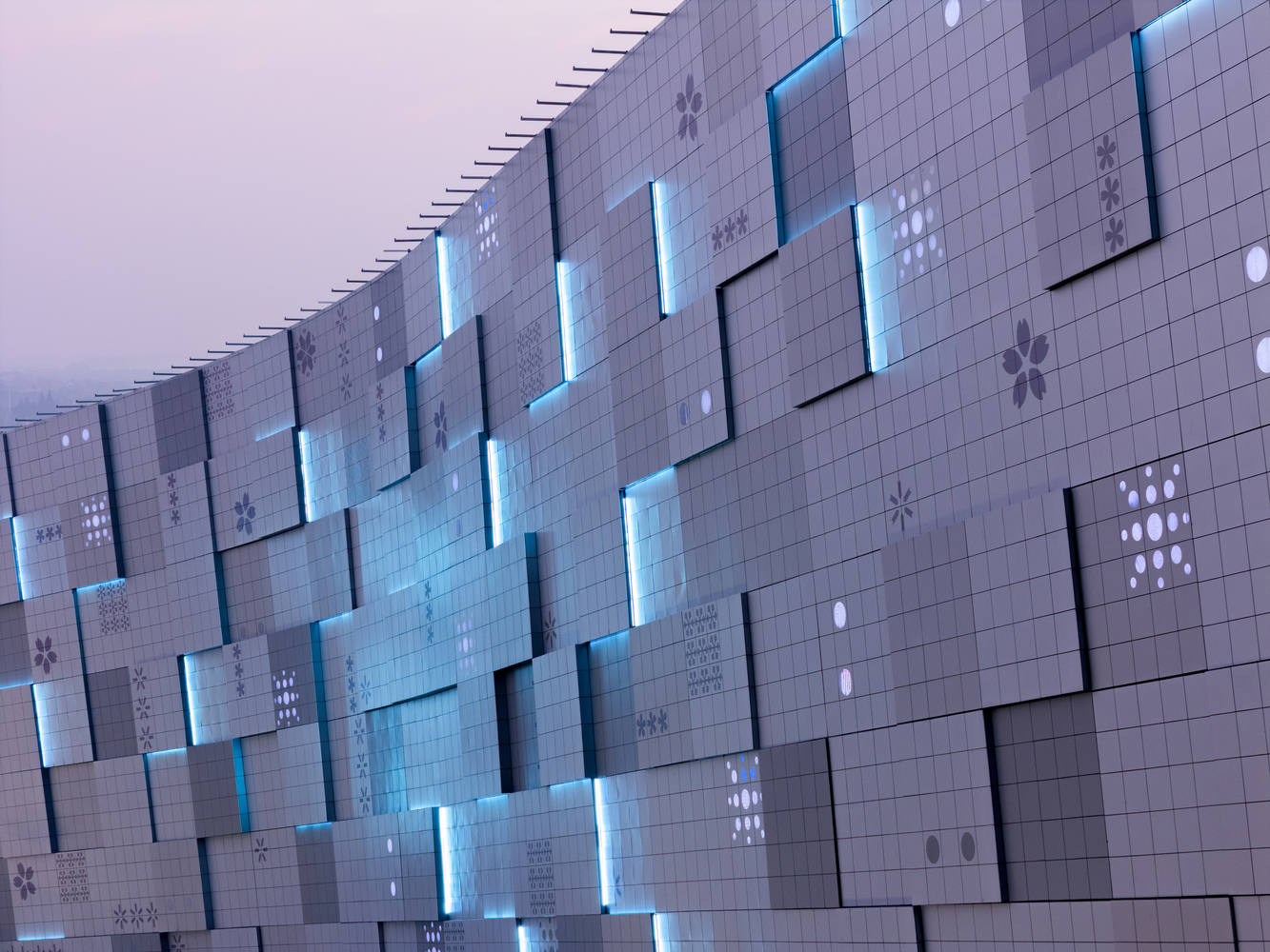 建筑师提供的文字描述各种娱乐、体育和零售设施围绕着一个中心湖,形成了一个超大型的商业综合体,建筑和立面呈阶梯状三维像素的互补比例。