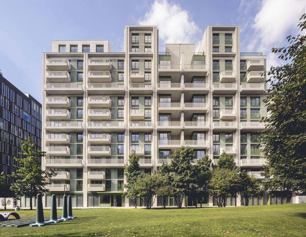 设计融合与创新:卡佩拉大厦巧妙地融合了社会和市场住宅,位于国王十字车站总体规划的核心。其立面设计运用奶油色和绿色三种关键材料,创造出具有强烈个性的外观。这种设计不仅体现了对周边环境的深思熟虑,还与相邻的Luma建筑在色调上形成呼应,同时与公园周围以深色为主的色调形成对比,展现出独特的设计创新。建筑的“L”形结构容纳了从单间公寓到四居室家庭公寓的多种类型,包括复式和错层公寓,这种多样性在东向公园的立面上得到体现,阳台的节奏和深度变化反映了不同户型的规划,展现了设计的灵活性和适应性。