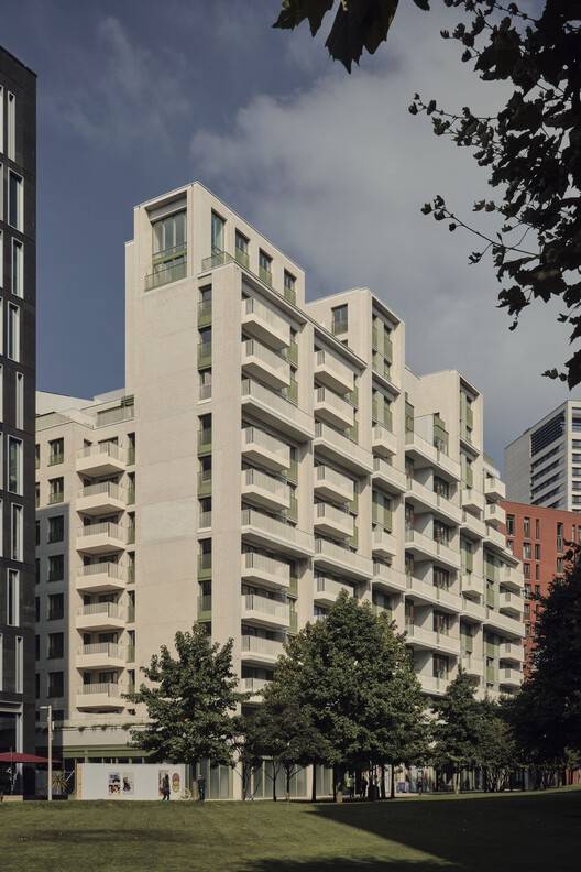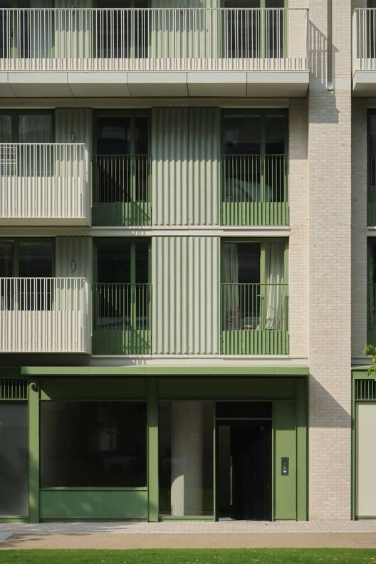 Text description provided by the architects. With a mix of social and market homes at the heart of the King's Cross masterplan, Capella provides a place for urban parkside living in one of London's most exciting neighborhoods. Three key materials, cream and green, have been employed to create a carefully considered facade with its own strong identity. The completed building is an important milestone in our twenty-year involvement in the evolution of King's Cross.