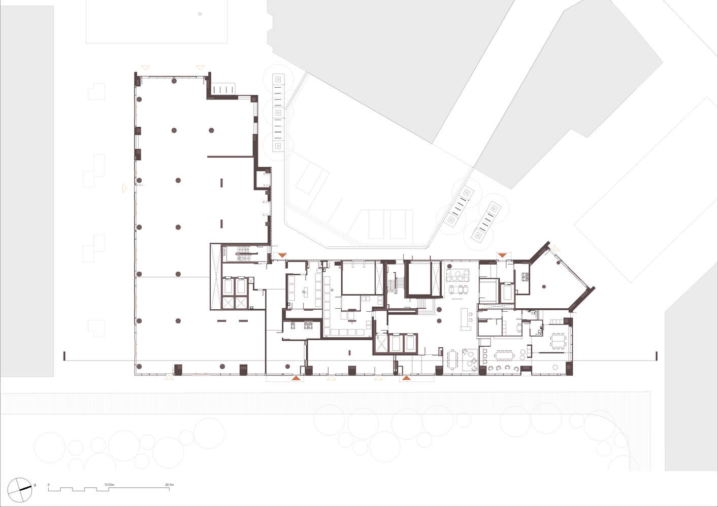 在建筑的北面,阳台立面被Chilton广场和Keskidee广场的框架立面所环绕。同时,九层朝南的立面交错排列,使这里的每个公寓都能向东看到刘易斯·库比特公园的景色。十二楼的顶部是五栋两层楼的房子,上面有私人屋顶花园,可以清晰地勾勒出天际线。在内部,两个大厅的电梯和楼梯通往简单的双载公寓布局,从宽阔的走廊进入,在可能的情况下,走廊是白天的。33种不同的公寓类型都通向阳台或露台,这些阳台或露台往往超过了所需的最小尺寸。Johnson Naylor负责市场公寓和一楼租户设施的空间规划和室内设计。这两个公寓都可以使用并共享一个260平方米的种植屋顶花园。