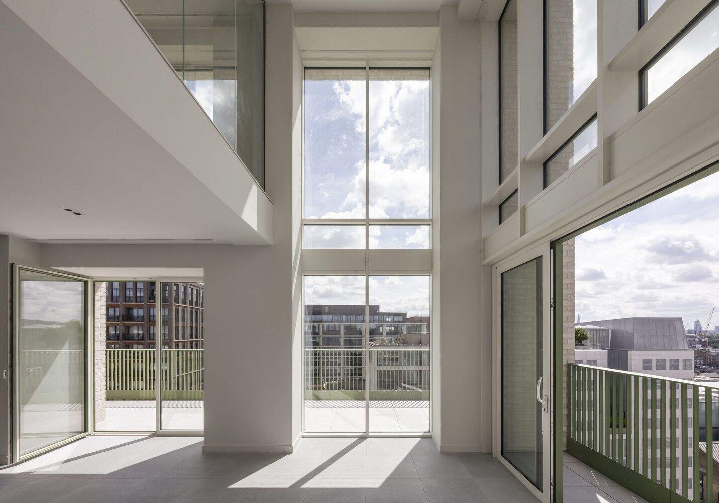 To the building's north a balconied facade is bookended by the framed elevations on Chilton Square and Keskidee Square. The nine-storey south-facing facade meanwhile is staggered to give each of the flats here a view east towards Lewis Cubitt Park. The twelfth floor is topped with five two-storey houses with private roof top gardens that articulate the skyline. Inside, the lifts and stairs from the two lobbies lead to simple double-loaded apartment layouts accessed from wide corridors which, where possible, are daylit. The 33 different apartment types all lead to balconies or terraces which often exceed the minimum required dimensions. Johnson Naylor is responsible for the spatial planning and interior design of the market apartments and ground-floor tenant amenities. Both tenures have access to and share a 260-square-metre planted roof garden.