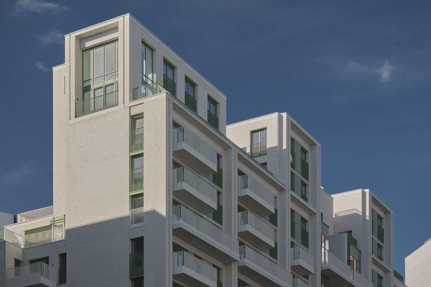 The 'L' shaped building hosts a variety of apartment types ranging from single studios to four-bedroomed family apartments, including duplexes and split levels. This variety manifests itself in the facade composition facing east across the park, where the balcony rhythm adjusts to reflect the apartments planned over two floors, and a series of deeper L-shaped balconies are attached to the one-and-a-half-height apartments. The vertical and horizontal balance of the facade composition is described in the weight and rhythm of the masonry piers rising through the height of the building, and the contrasting lines of white precast balconies which complete every third floor. This triple height order contains the intermediate and more delicate white metal balconies which project in front of the olive green colored window frames separated by light green concrete panels.