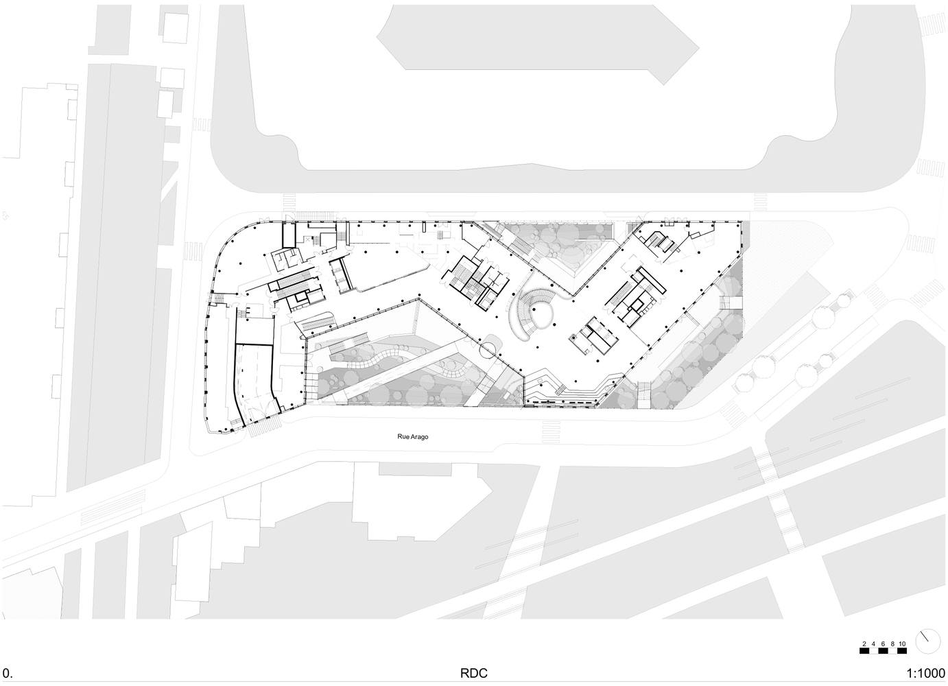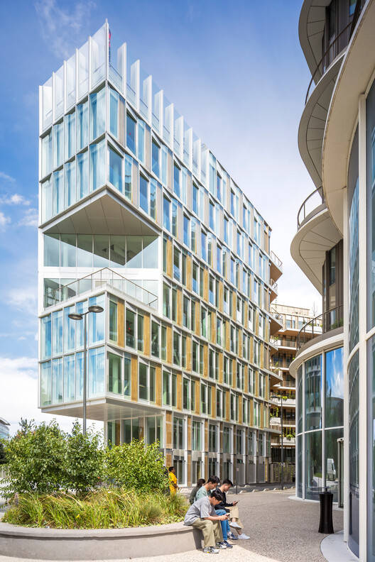 立面的差异化处理增强了这种柔和的过渡。建筑红线上的立面由并置框架的“均匀纹理”组成。这种水晶般的皮肤,以其多样的模块,给人一种宏伟的印象。另一方面,立面像景观洼地一样排列在弯曲处,由装有种植棚架的阳台(运行)组成。它们是意外之地、户外工作场所和高等教育课程中新的第三名。外部楼梯网络将每个露台和花园连接成一条连续的路径。
