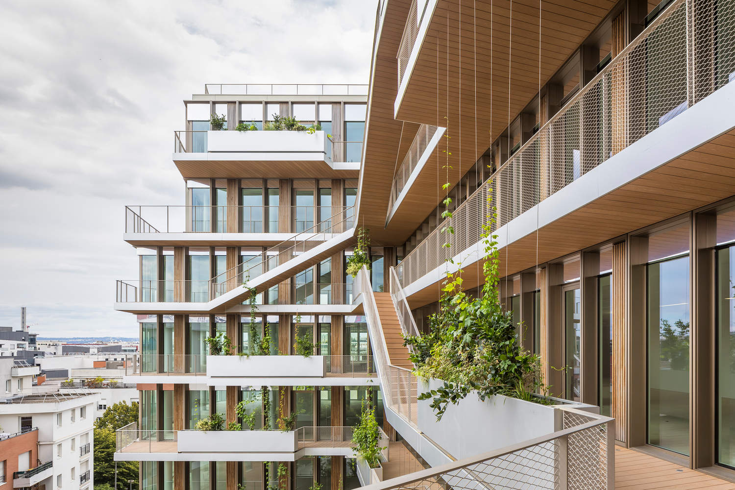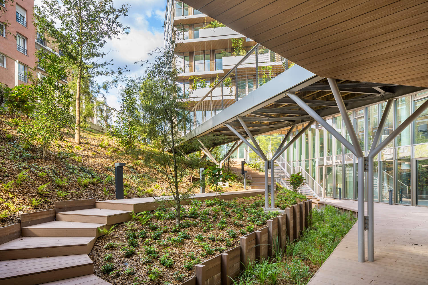 This gentle transition is enhanced by the differentiated treatment of the facades. The façades on the property lines are composed of a "uniform texture" of juxtaposed frames. This crystalline skin, with its multiplicity of modules, conveys an impression of grand scale. On the other hand, the facades, arranged in the inflections like landscaped hollows, are made up of balconies (that run) equipped with planted trellises. They are places of serendipity, outdoor workspaces, and new third places in tertiary programs. A network of external staircases connects each terrace and garden in a continuous path.