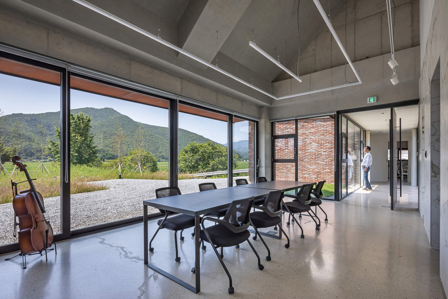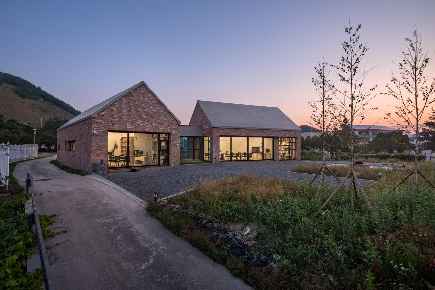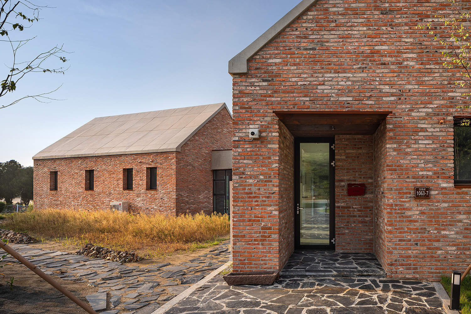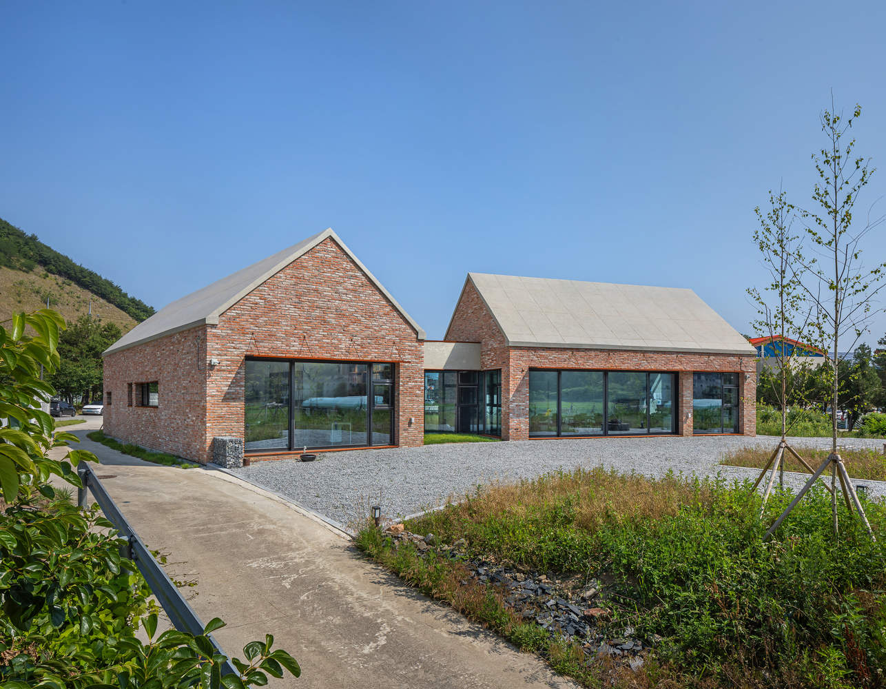 Architecturally, the office features exposed concrete gabled roofs and a facade of reclaimed brick, giving the building a sense of timelessness. While newly constructed, it evokes a feeling of belonging to the site, blending seamlessly into the landscape without overwhelming its surroundings. The two distinct masses are designed to align with the natural axis, harmonizing with the local environment, a key design intention.