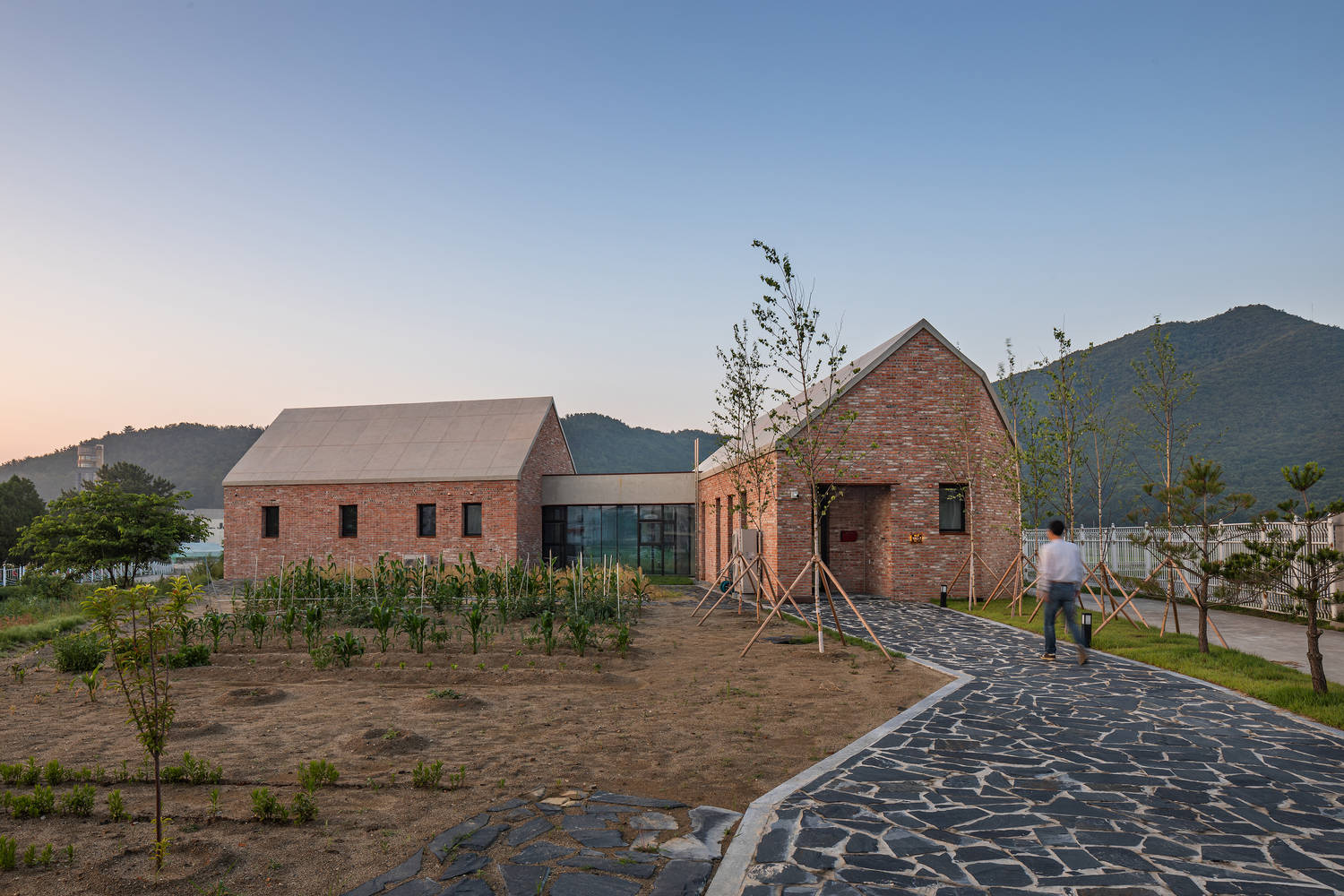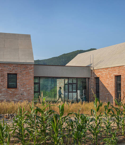 建筑语言与地域文化的融合:在建筑风格上,项目采用了暴露的混凝土山墙屋顶和回收砖的立面,赋予建筑一种永恒而质朴的感觉。这种设计不仅体现了对材料的巧妙运用,还与郑东进的历史和文化相呼应,展现出一种对场地的归属感。建筑的两个不同体量与自然轴线对齐,进一步强化了与当地环境的协调性,使建筑成为地域文化的一部分,同时也为当地社区带来了一种新的活力和认同感。