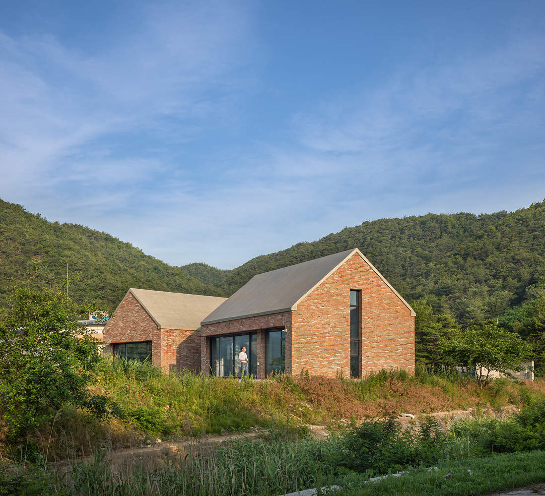 Between Jeongdong Stream and the Fields – The office is situated between Jeongdongjin village and the adjacent fields, facing the main gate of Jeongdongjin Elementary School. To the northeast lies the Jeongdong Stream reservoir, where reeds sway in the spring, while to the south, open fields bask in warm sunlight and scenic beauty year-round. The elongated site narrows as it slopes toward the river, allowing for a layout where the building is positioned at the northern end, creating an open southern courtyard. Functionally, the office required two main spaces: a design workspace for staff and a private office for the architect. These spaces are separated but visually connected through a transparent passage, which bridges the northern and southern areas, thereby creating a seamless relationship with nature.