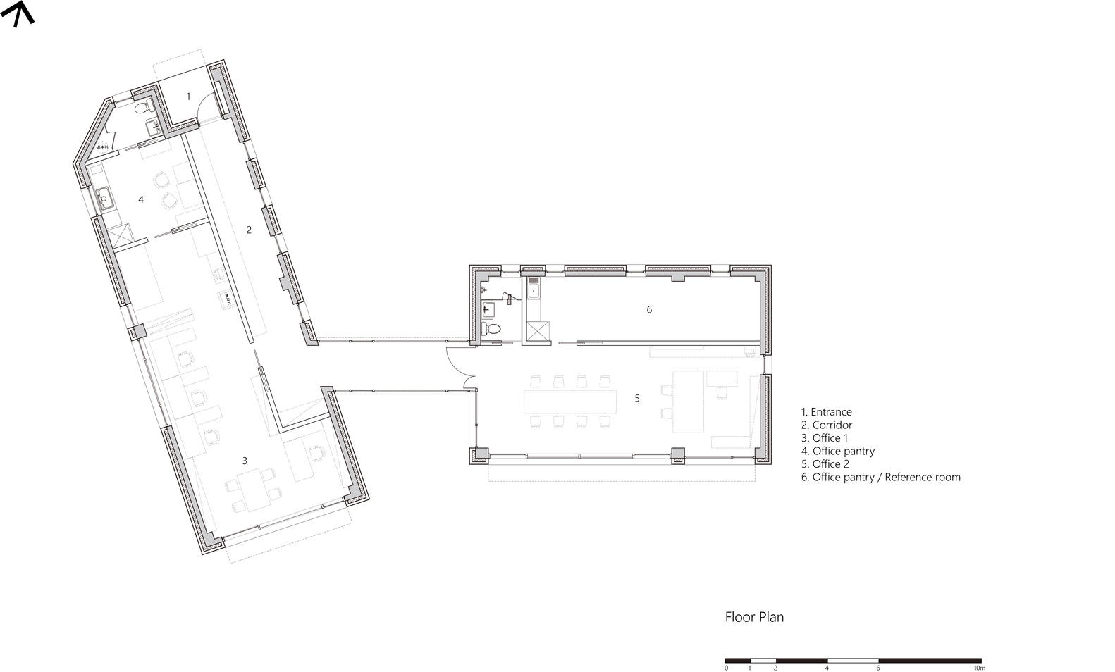 连接两个空间-该建筑的布局旨在满足其功能需求。入口位于北侧,道路通往现场。进入后,游客会被引导穿过一条长长的走廊,这条走廊既是展览空间,也是通往其他区域的通道。在北面,员工工作区包括一个用于模型制作和设施的多功能区。再往前走,走廊通向位于南面的建筑师私人办公室,其中包括卫生间和一个用于存放大量材料的存储区。这种设计有效地连接了空间,使从一个区域到下一个区域的流动顺畅。