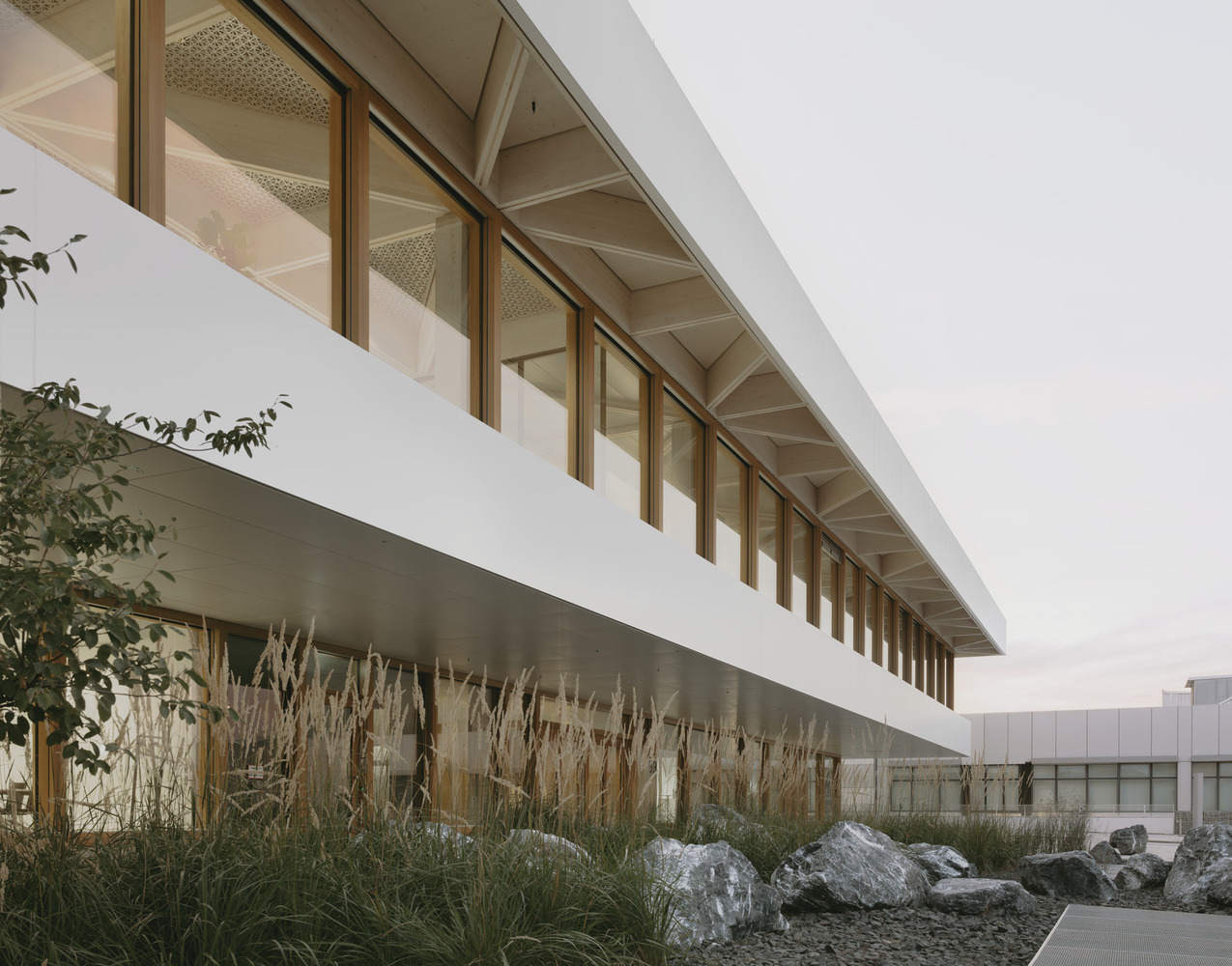 独特的设计与功能融合:特朗普夫-施拉姆伯格技术中心的设计巧妙地将多种功能融合于一身。建筑不仅包含了实验室、办公室和会议区,还设有可容纳400位客人的大型校园餐厅。其正交建筑模型和内部庭院的设计,为建筑带来了良好的采光和视觉联系。木质和玻璃立面的使用,使其在以金属为主的园区中脱颖而出,体现了其独特的功能和身份。这种设计不仅满足了功能需求,还提升了建筑的美学价值,使其成为园区中的一处亮点。