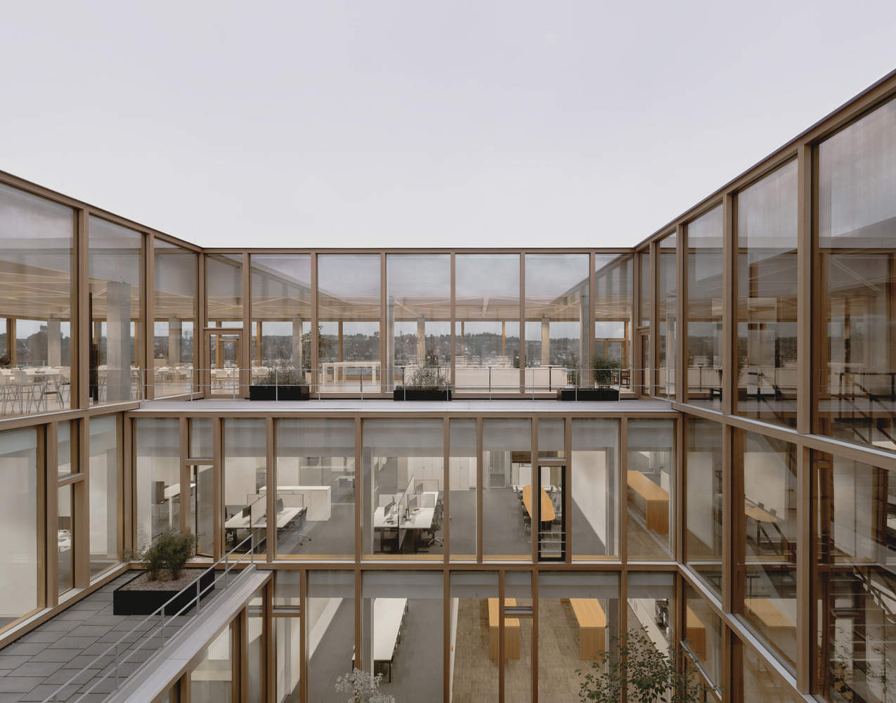 Orthogonal buildings, each surrounding an inner courtyard, serve as a basic model for the Schramberg campus. The approximately 60 x 60 meter Tech Center follows this logic, although its levels are slightly staggered, such that its cubic form, interrupted by cantilevers/canopies, steel parapets, and terraces, gives it a more dynamic and horizontal feel than the neighboring buildings. Its wood and glass façade likewise sets it apart from the predominantly metal production and research buildings, conveying its unique function. The central courtyard allows daylight to penetrate deep into the building, creating visual connections and allowing for transparency and orientation. The glass partitions provide rooms on all levels with a visual connection to the outside space and to the garden, across the inner courtyard. The main, open staircase is directly adjacent to the courtyard and, with its mirrored surfaces, is more a sculptural installation and place of movement and encounter than an access element.