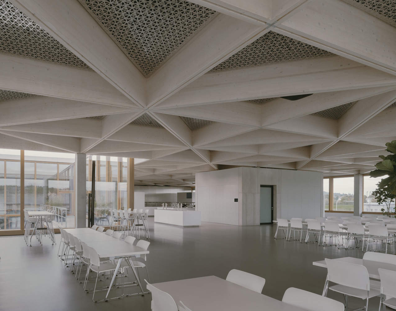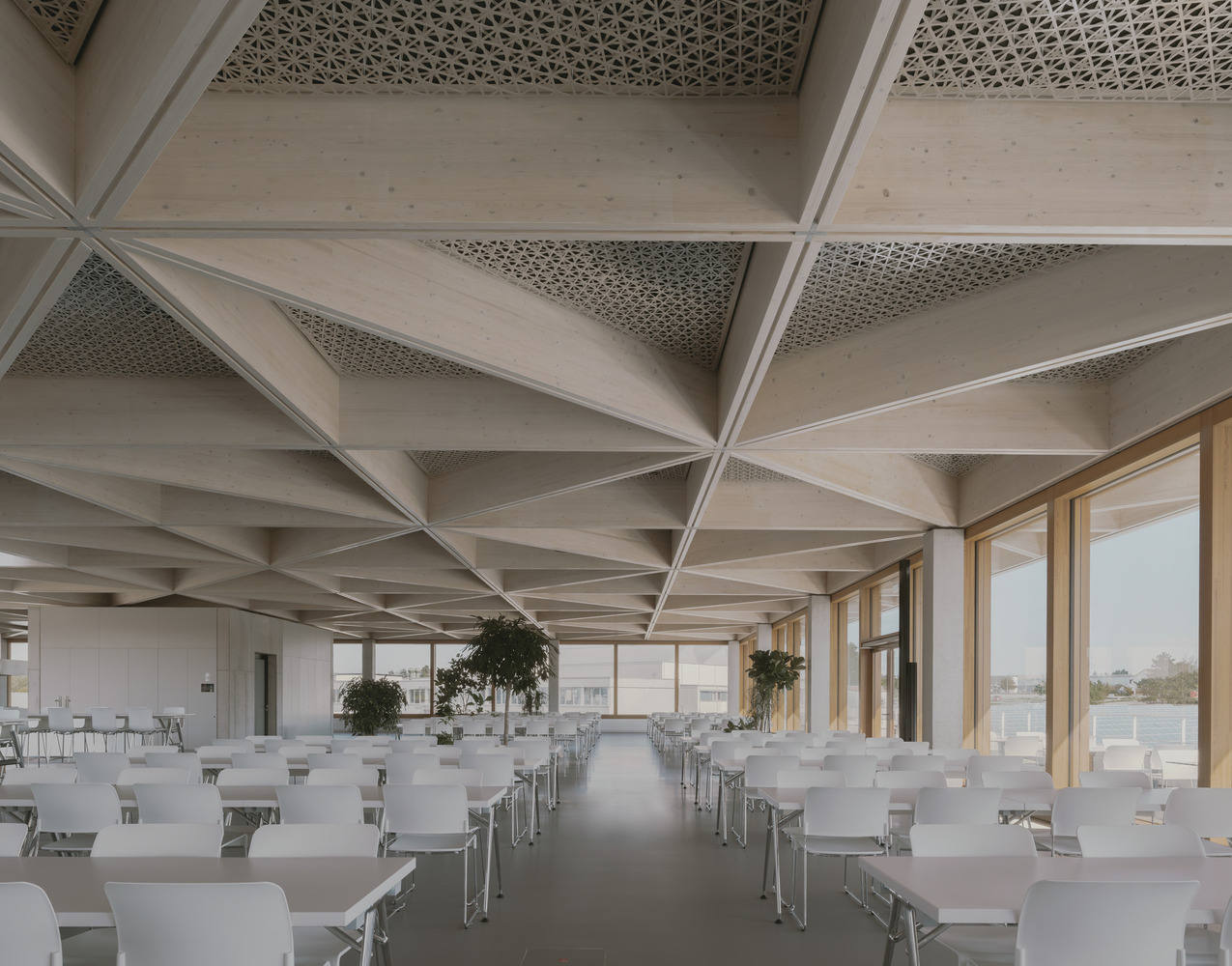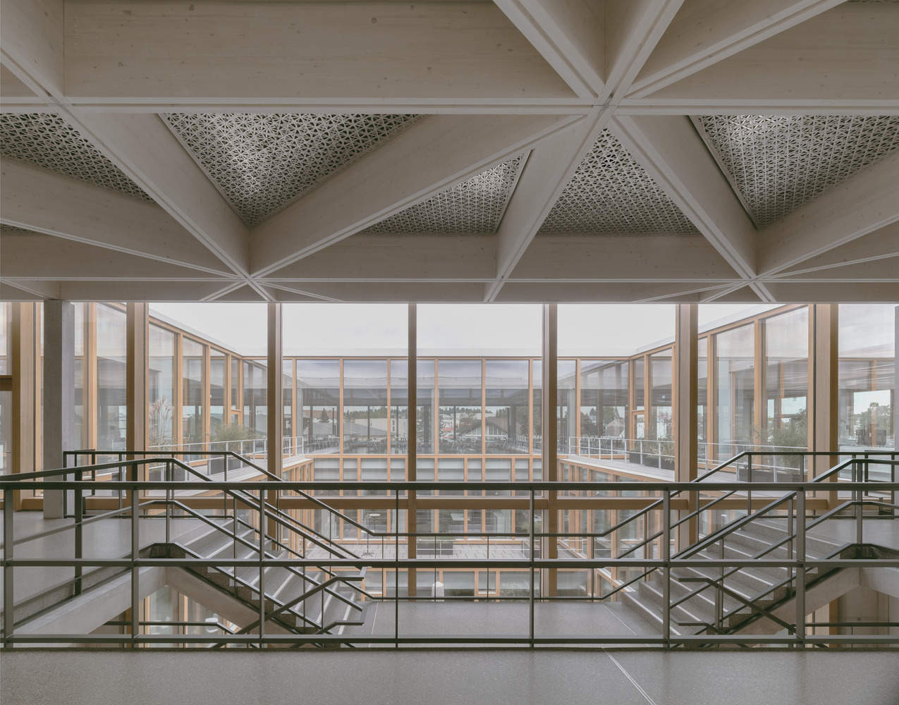 Visitors enter the building on Level 0 through an expansive lobby that overlooks the courtyard. In addition to the exposed concrete and larch wood surfaces, the space features a gray terrazzo floor and a stainless-steel wall with laser-engraved ornamental hatching. With its triangular pattern, the suspended ceiling mimics the building's timber roof structure. In addition to the lobby, the entrance level contains office and conference areas for lower and upper management, organized in a ring around the courtyard. Nearly all of the building's office workstations exit onto a terrace, courtyard, or garden. At the rear of the existing production building are the delivery and ancillary rooms for the kitchen, which is located directly above, on the top floor. The kitchen serves the campus restaurant, which, thanks to the ceiling's light, expansive, triangular timber frame, remains a column-free space that flows around the inner courtyard as a cohesive, communal area. With 3.6 meters of headroom, expansive views of the surrounding landscape, and optimized acoustics, it offers employees a place for relaxation and encounter. Between each of the gluelam beams is a panel consisting of two sheets of acoustical fleece, laser-cut on TRUMPF machines. A slight offset between the panels creates a visual moiré effect, and necessary technical installations such as lighting, loudspeakers, and sprinklers have been integrated flush with the surface.