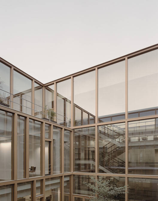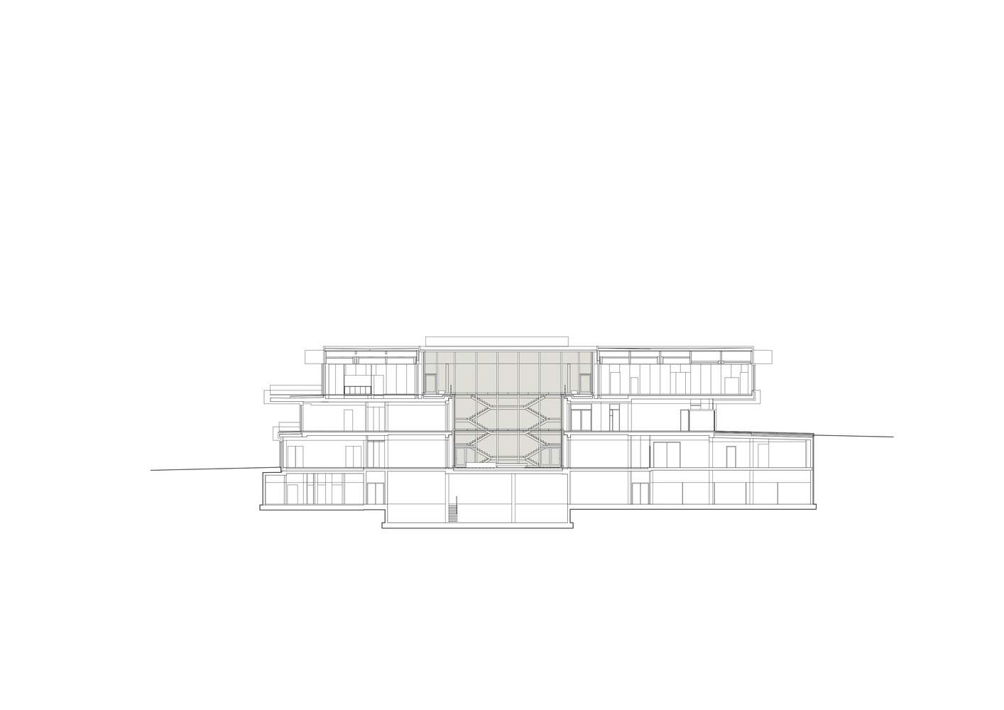 正交建筑,每栋建筑都围绕着一个内部庭院,是Schramberg校园的基本模型。大约60 x 60米的技术中心遵循了这一逻辑,尽管其楼层略有交错,因此其立方体形式被悬臂/檐篷、钢栏杆和露台打断,使其比邻近的建筑更具活力和水平感。其木质和玻璃立面同样使其与以金属为主的生产和研究建筑区别开来,传达了其独特的功能。中央庭院允许日光深入建筑,创造视觉联系,并允许透明度和方向性。玻璃隔断为所有楼层的房间提供了与外部空间和花园的视觉连接,穿过内部庭院。主要的开放式楼梯直接与庭院相邻,其镜面更像是一个雕塑装置和运动与相遇的地方,而不是一个入口元素。