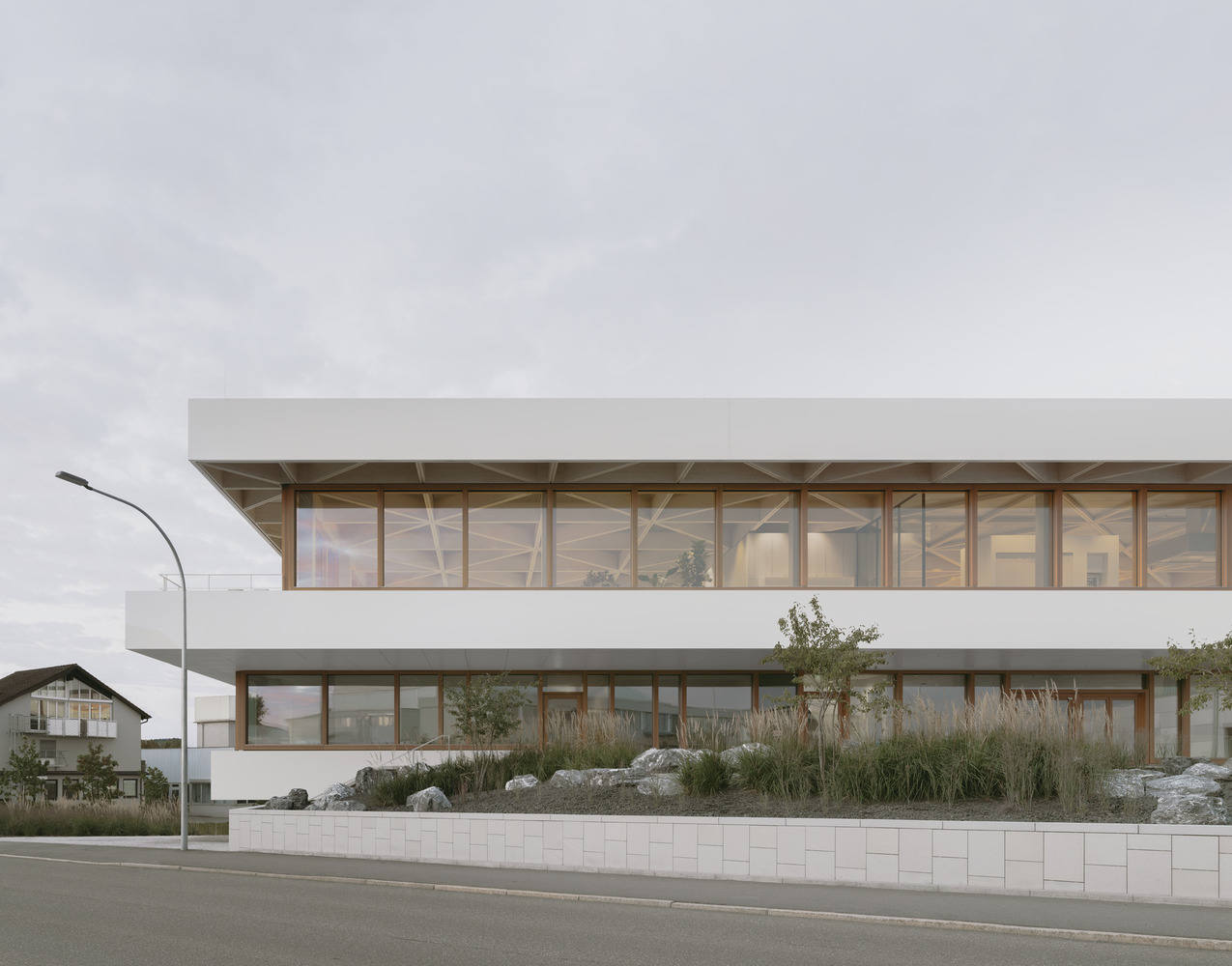 The new building serves as a main entry point to the entire campus, and thus as the "face" of TRUMPF in Schramberg. Employees enter the building from the garden level (Level -1), which provides access to all other levels and a direct connection to the neighboring production facility. This administrative and laboratory floor also houses application laboratories, offices, meeting rooms, and a conference area that can be used for events with up to 100 participants. The lower level (Level -2) houses test laboratories, locker rooms, storage and technical areas, and a large sprinkler control center for the entire site. A tunnel to a future second production building has also been constructed.