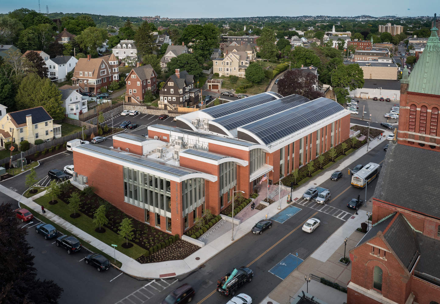 The roof was designed to screen all rooftop mechanical equipment from abutters. Over 600 solar panels cover its curved surfaces, making the all-electric building Massachusetts's first Net-Zero Energy public library, generating enough power on-site to offset its anticipated energy consumption.