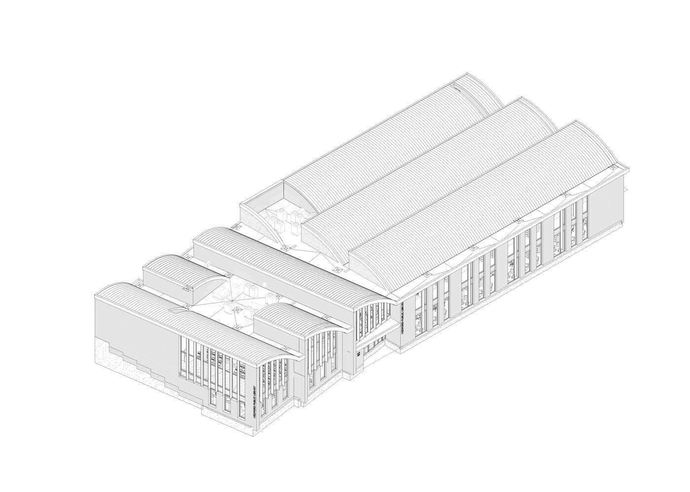 该建筑波浪形的屋顶形式和木板衬里的天花板的灵感来自梅德福作为神秘河上快船制造中心的丰富历史。外部材料的选择是为了适应其直接的环境:街道立面覆盖着红色诺曼砖,而面向社区的后立面则由水平的HPL雨幕覆盖板制成。弯曲的屋顶是直立的接缝金属,铝复合材料构成了装饰。在内部,弯曲的天花板内衬着穿孔的吸音板,使内部空间具有船体般的特征。主阅览室装饰着梅德福的历史地图,创客室则展示着一艘大型快船的横截面。
