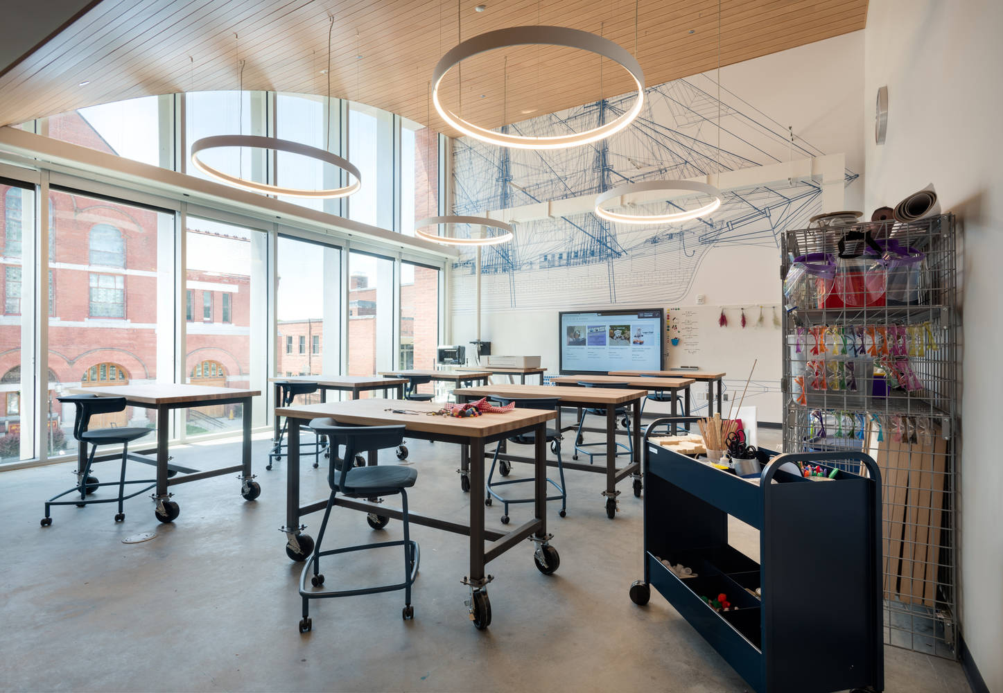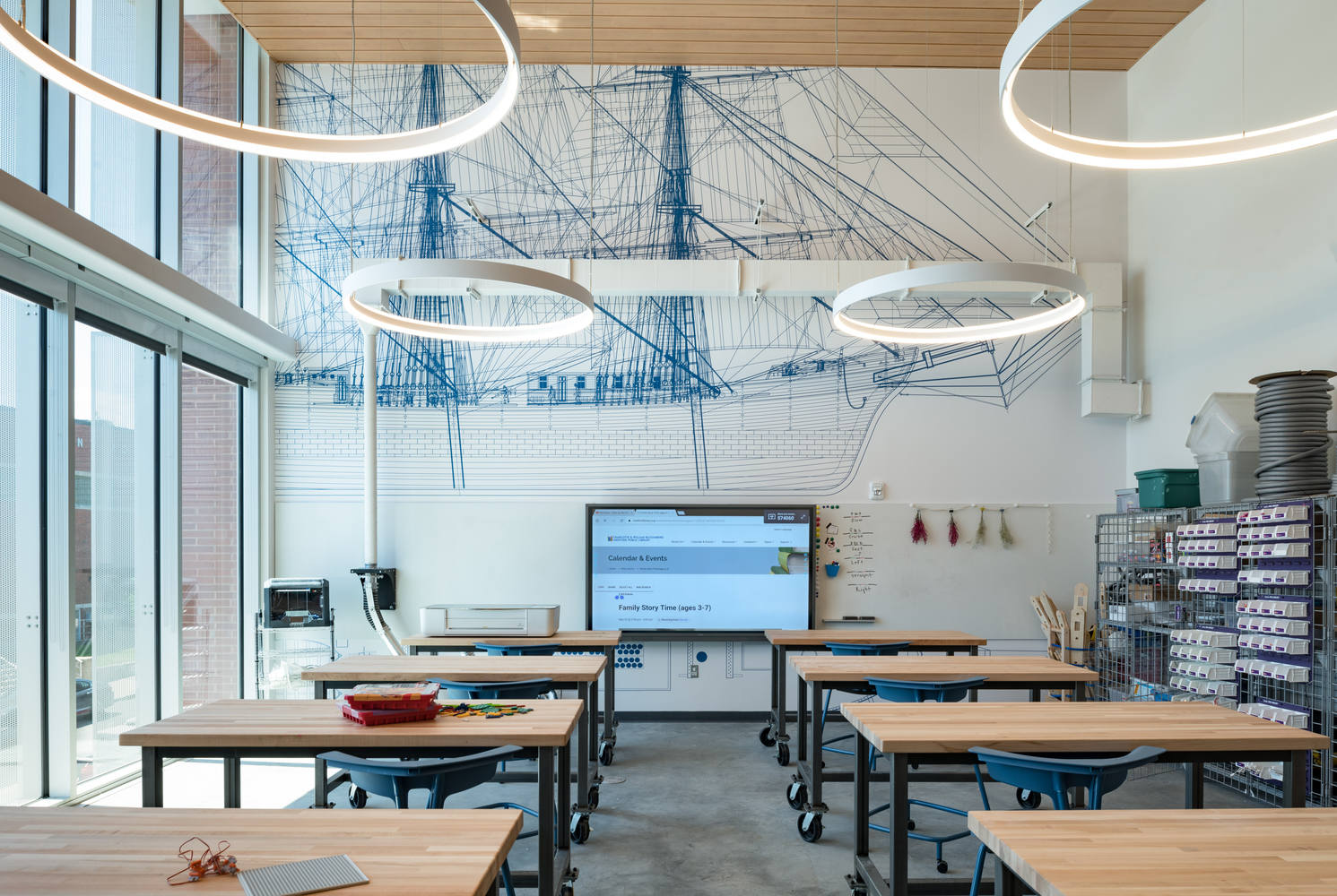 The building's wave-like roof forms and plank-lined ceilings are inspired by Medford's rich history as a clipper ship manufacturing hub on the Mystic River. Exterior materials were selected to be responsive to their immediate context: The street façade is clad in red Norman brick while the rear, neighborhood-facing façade is created with horizontal planks of HPL rain-screen cladding. The curved roofs are standing seam metal, with aluminum composite material forming the trim. Inside, the curved ceilings are lined in perforated acoustical planks, giving interior spaces a hull-like character. Pixelated historic maps of Medford adorn the main reading room, and a large cross-section of a clipper ship is featured in the Maker Room.