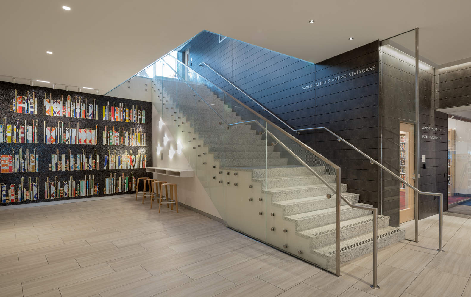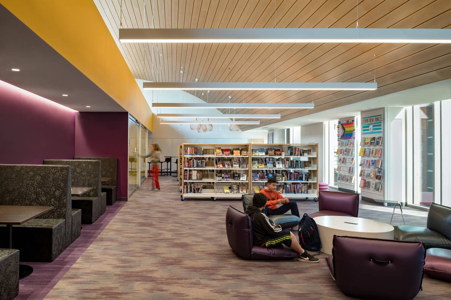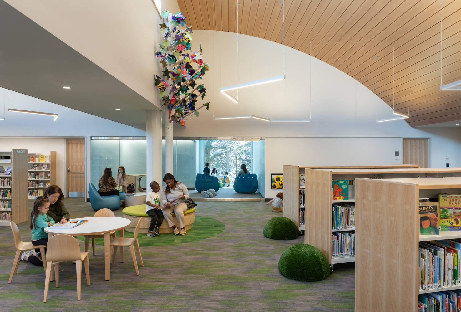 Much more than a repository of books, the community-centered library features dedicated areas for programs and events for each age group, complemented by an array of spaces for the public to meet and collaborate. Musicians reserve group study rooms to practice together; local business owners use quiet alcoves to focus, adult learners use the computing resources; teens participate in cupcake decorating contests and poetry slams; children flock to story time, and seniors learn how to record a podcast.