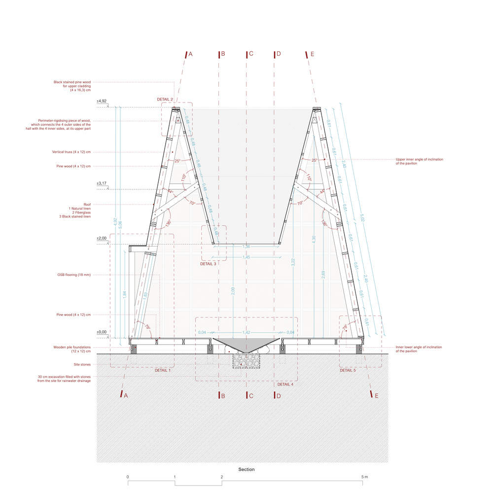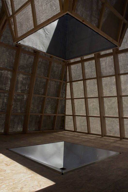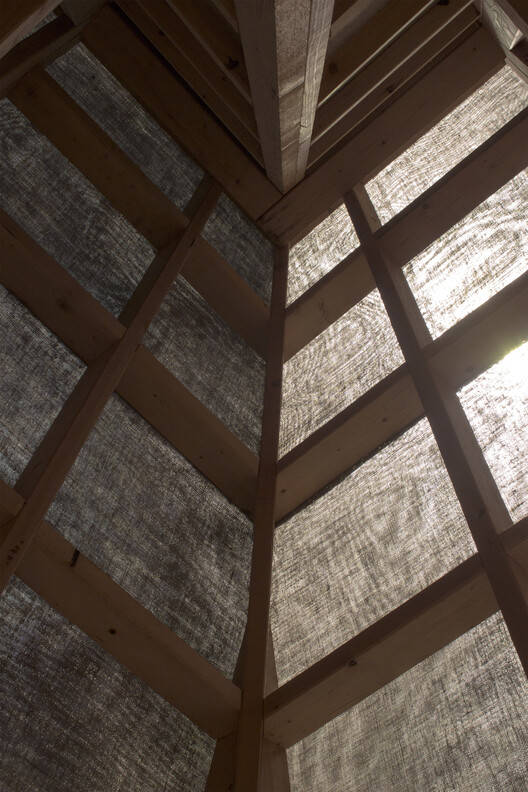 The material resolution seeks to maximize the sensorial and perceptive experience of the space with the use of the minimum, in this case only through three materials: a pinewood structural framework that gives body to the ‘water shelter’; fiberglass with resin, which acts as a protective membrane, allowing light to pass through but providing a waterproof envelope that is resistant to the passage of time; and finally, the 100% locally manufactured linen, which forms the exterior and interior skin of the pavilion in a differentiated way, with black stain protection on its external face and with its natural expression on the inside, thus reinforcing the duality between shell and interior as an ambivalent exercise that allows the spatial experience to be qualified.