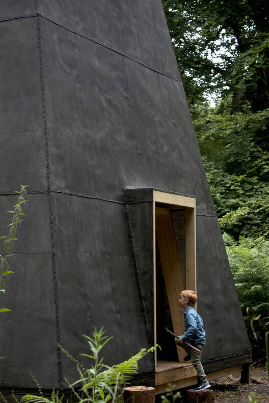 Text description provided by the architects. COMPLUVIUM stands as an allegory to water, seeking to highlight the most characteristic climatic condition of Rouen and the wooded environment of Canteleu, the heavy rainfall that abounds throughout the year. It is a ‘spatial artifact’ with a timeless character, which, on the one hand, appears defined by a recognizable geometry, in evident contrast with the natural surroundings, and, on the other, attempts to subtly disappear through a work of linen and fiberglass skins, materials which, on contact with light, transform its appearance and end up disappearing in the landscape.