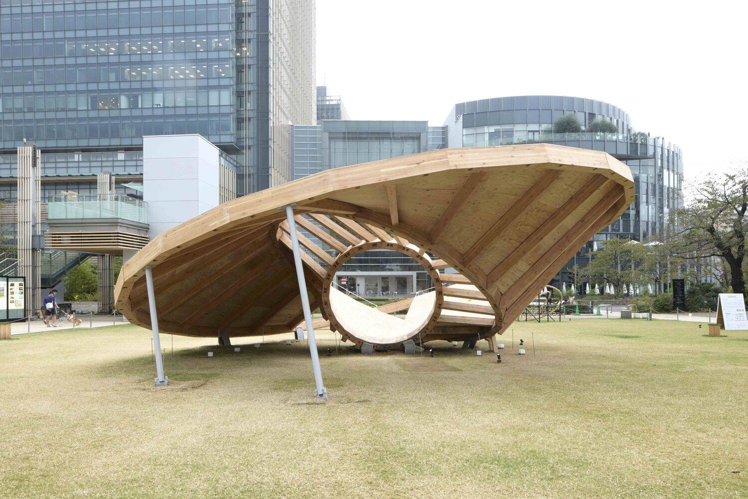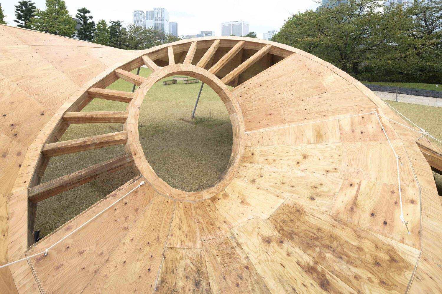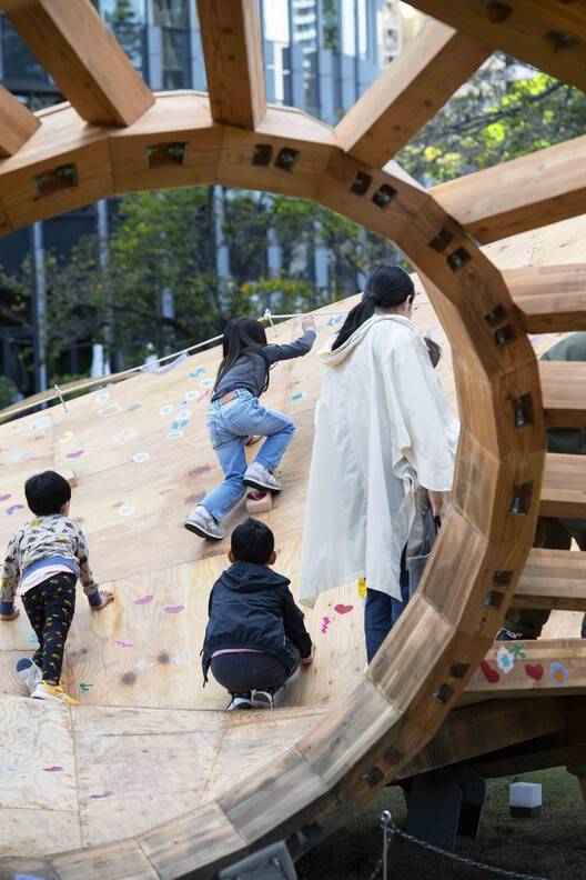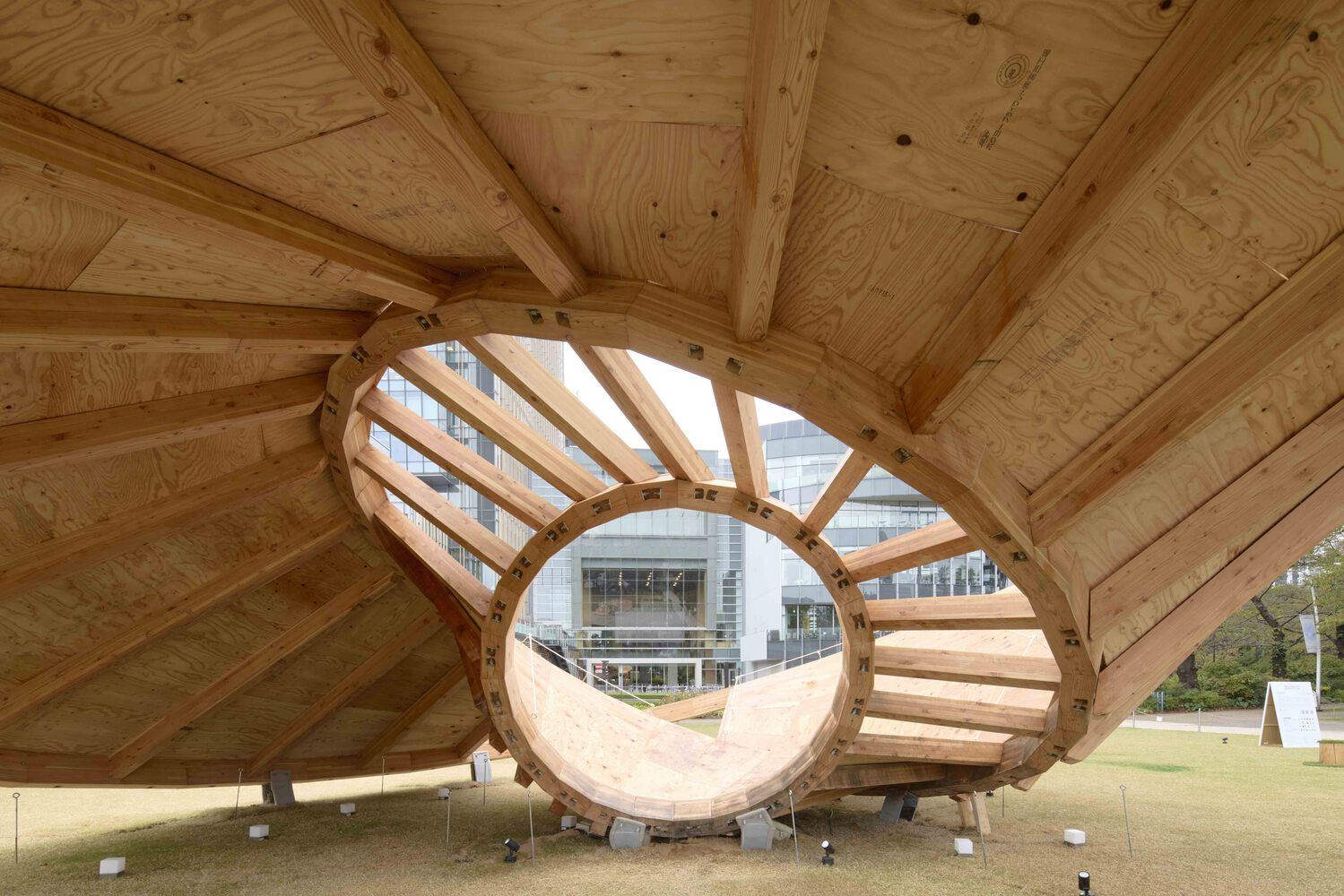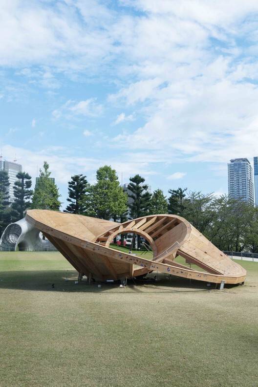 Text description provided by the architects. This pavilion is designed by Taichi Kuma for Tokyo Midtown DESIGN TOUCH 2024. The main structure is made out of 3 timber rings. They are varied in size such as 2m, 5m, and 10m. Each Ring is touching the ground and the plywood surface is created in between each ring.