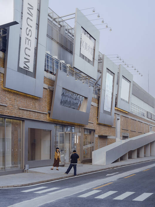 Therefore, we set up 13 "Frames" and 3 "Exhibition Niches" on the exterior facade to display signs, banners, graphic arts and installations, turning the street into an "outdoor gallery" for the museum to externalize its content and interact with pedestrians. The 8 "Frames" that were eventually implemented after several rounds of value engineering are concentrated on the most populated street corner of the facade. The one "Frame" on the ground floor is used as a sliding gate for vehicles and large art works to enter the building, while the rest 7 "Frames" contain LED screens, slanted mirror niches and expanded metal mesh. As for the "Exhibition Niches", there are one protruding out and one carved into the facade, while the third and largest one being cantilevered above the southwest corner of the remaining red brick wall, consisting of two mirroring side surfaces and a LED screen ceiling. It holds a huge golden X sign as well as three mirrored reflections of the X in its inside corner. This slightly surrealist installation is both the major sign of the museum and a parody response to the many cartoonish decorative facade sculptures in the Langyuan Station campus.