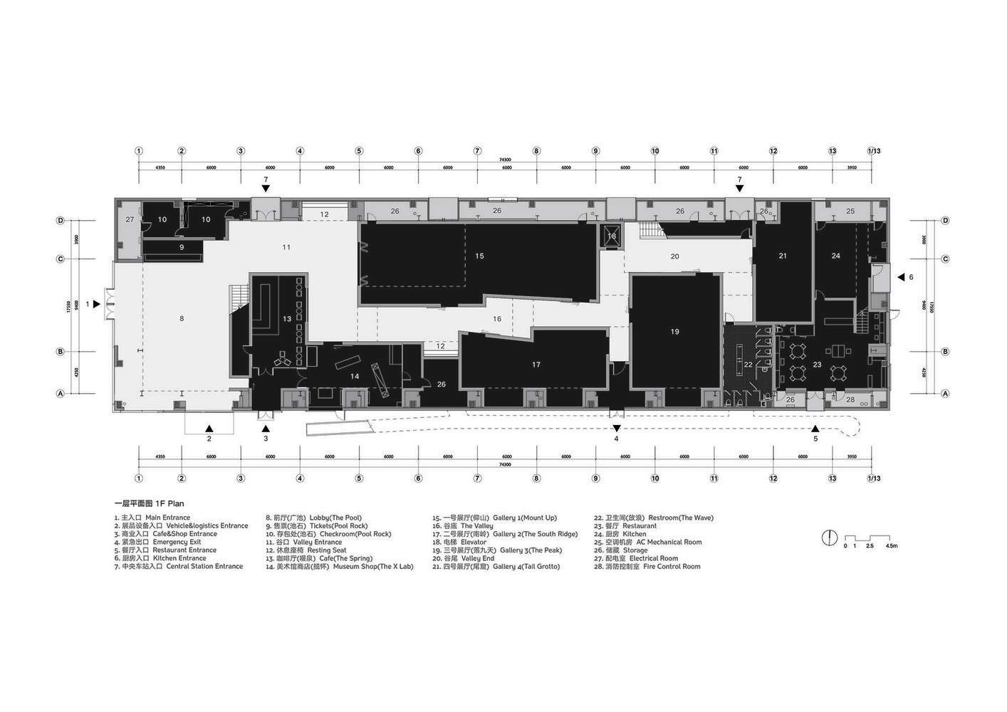 设计从剖面开始。之前的翻新使具有纪念意义的新特拉斯天窗屋顶成为唯一的自然光源,再加上仓库的线性体量和近端主入口位置,我们自然将该场地与“山谷”的理念联系在一起。由于占据整个内部的混凝土平台不符合展览馆的天花板高度要求,并堵塞了通往一楼的天窗,以及游客对场地实际规模的感知,我们决定将其拆除,并保留过去的其余装修遗迹。博物馆设计简介所需的程序卷沿着两条长边墙排列,在中间留下一个狭窄的天窗空间“山谷”,作为主要的流通通道和展览空间。这些分段空间布局使两层楼都可以进入天窗,并利用了13米高的地板到天花板高度的强大视觉冲击力。同时,上次翻修的机械腔可以保留下来供新的程序卷使用,“山谷”为每个展览馆独立管理创造了可能性。