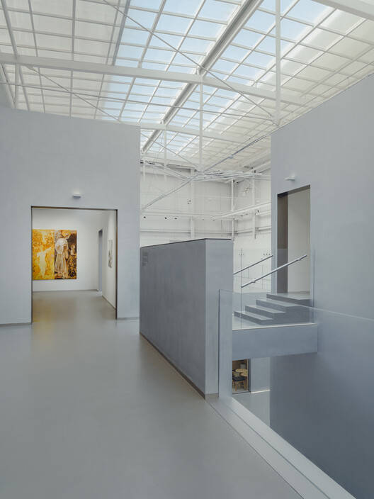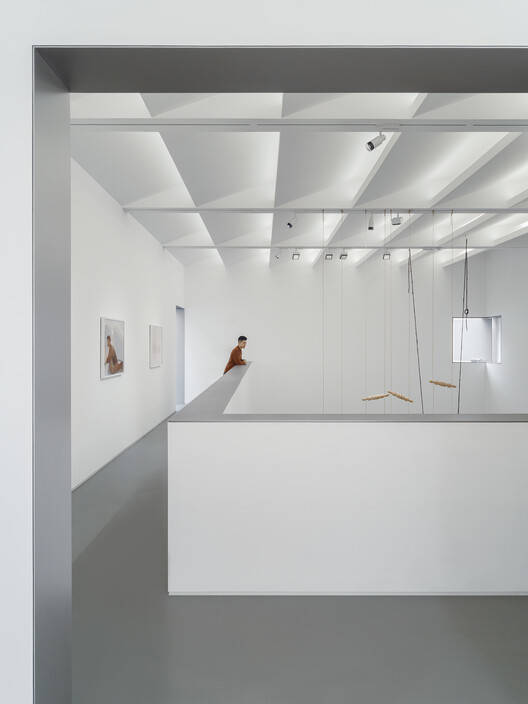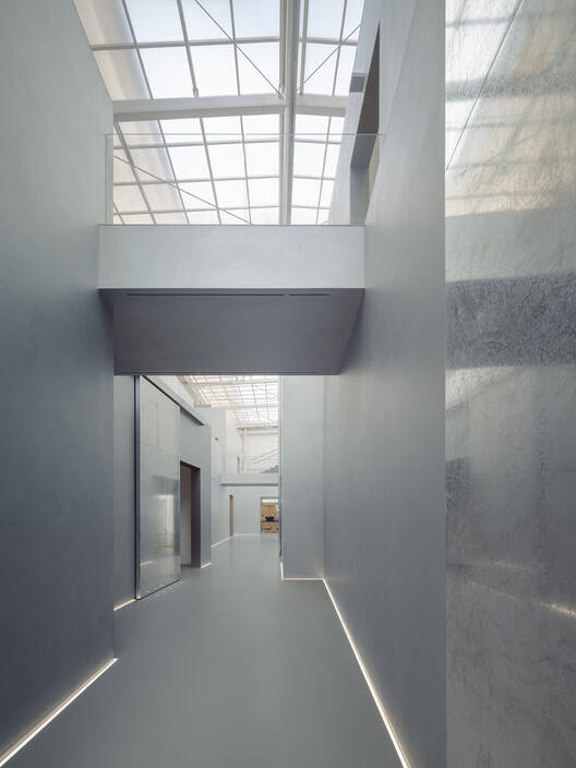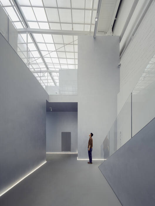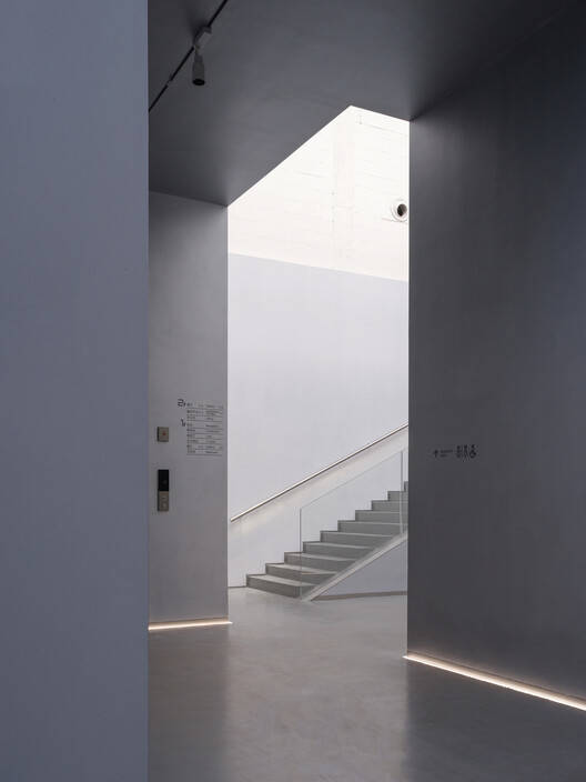 The design started from section. The prior renovation resulted in the monumental new truss skylight roof to be the only natural light source, plus the linear massing and short-end main entrance location of the warehouse, we naturally associated the site with the idea of a "valley". Since the concrete platform that occupied the entire interior did not meet the ceiling height requirements of exhibition galleries and blocked the skylight to the first floor as well as visitors' perception of the actual scale of the site, we decided to dismantle it and keep the rest of the past renovation remnants. The programed volumes required by the museum's design brief were arranged along the two long side walls, leaving a narrow skylit space-the "Valley"-in the middle as both a main circulation path and an exhibition space. These sectional spatial arrangements allow both the two floors to have access to the skylight, and take advantage of the powerful visual impact of the 13-meter-high floor to ceiling height. Meanwhile, the mechanical cavity from the last renovation can be kept for use by the new programmed volumes, and the "Valley" creates possibility for each exhibition gallery to be managed independently.