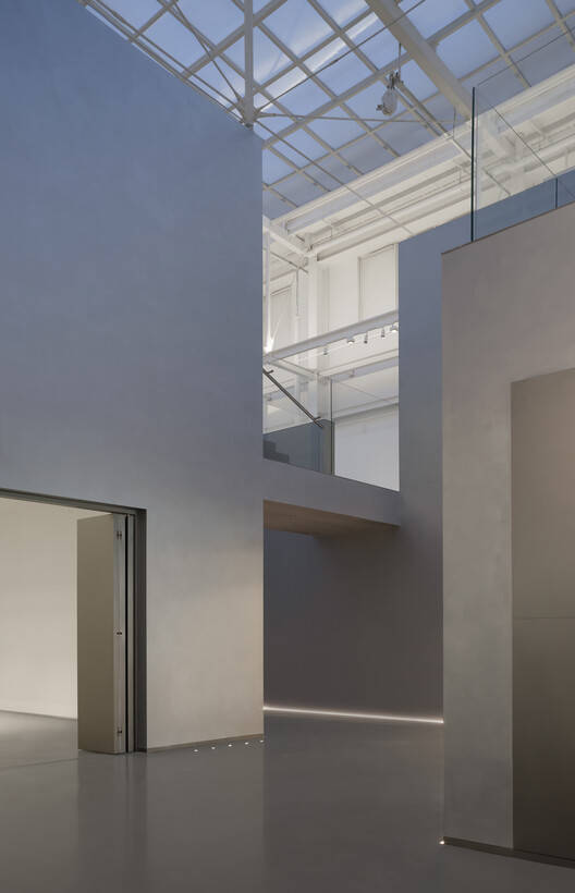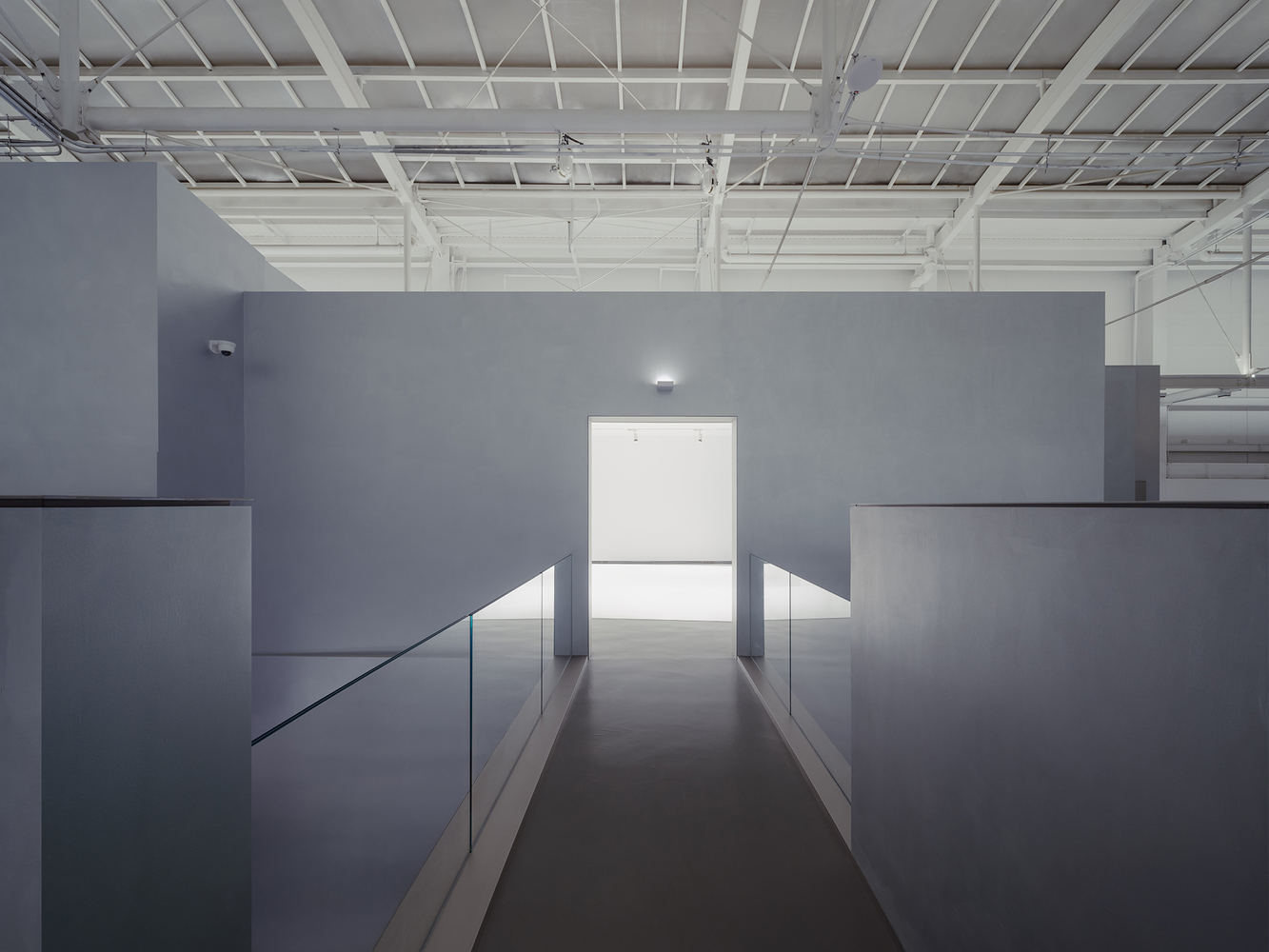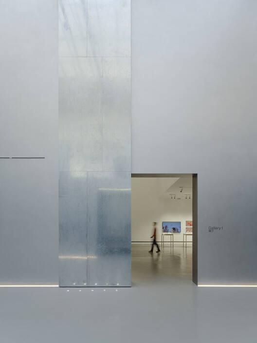 The binary division of the "Valley" and the "Mountain Rocks" creates a new spatial layering of "outside" and "inside" within the interior, and metaphorically juxtapose the experience that visitors will have in X Museum to one would experiencing in a real valley in the nature - not unlike the metaphorical narrative adopted by traditional Chinese gardens and paintings: the lobby, a double-height open atrium for events and large installations, is the "lake" that one have to cross to enter the "Valley"; the staff office on top of Gallery No.3, as the highest volume in the whole museum, is the "peak" of the "mountains"; six galvanized steel sliding doors - the highest being 8 meters tall - hanging on special warehouse gate tracks, are "waterfalls". After entering the "Valley", visitors will shuttle back and forth between the "valley" and the "mountain" via a series of apertures, stairs and bridges. Although meandering in an interior space, the spatial experience is like that of an outdoor environment.