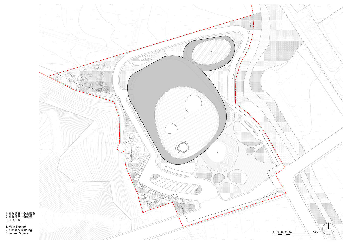 建筑师提供的文字描述Text description provided by the architects. The architects design two "cradle" like shapes for this proejct, one large and one small. The large volume is located at the center of the land, accommodating the main function of the performance, while the small volume is on the right side of the main building, arranging actor dormitories, rehearsal halls, and auxiliary functions. Both volumes adopt a sloping section to present the roof in front of the audience. With local plants all over the sloping roof, taking advantage of the abundant rainfall in the area, it reduces manual management costs. The two volumes are connected together, and this charmingly naive shape reminds people of Panda mother and son.