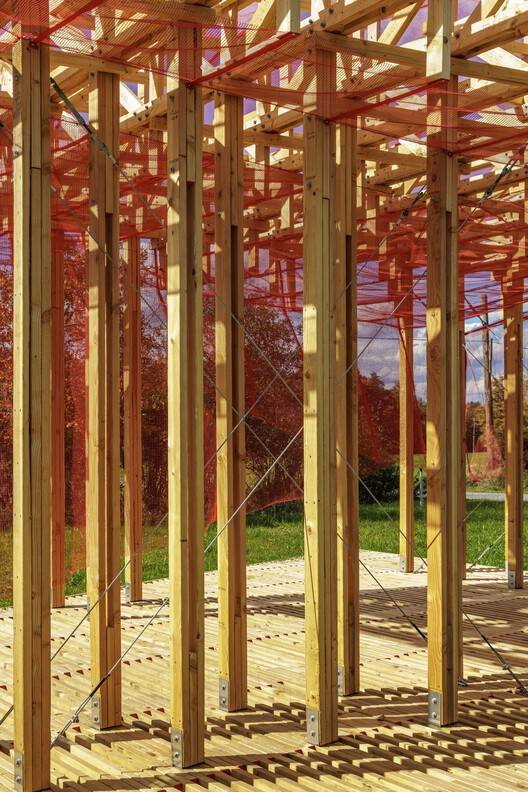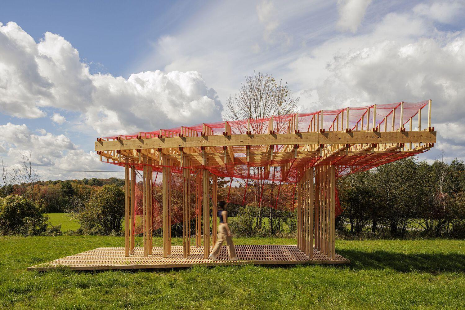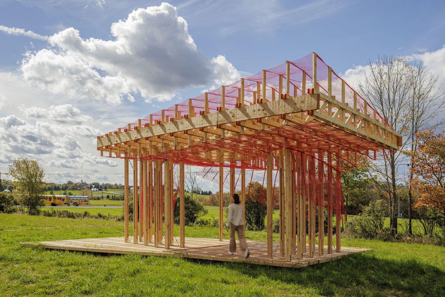 Text description provided by the architects. Curtain Call is a winning design for the 2024 edition of BuildFest at the Bethel Woods Center for the Arts. Each year, BuildFest selects teams of university faculty to design and construct large-scale art installations on the historic grounds of the 1969 Woodstock festival. This year's theme challenged participants to explore the intersection of digital and physical construction methods. By embracing Human-Robot Collaborative Construction (HRCC) techniques, Curtain Call breaks from conventional modes of design and fabrication to develop a pavilion that references the tectonics of the Woodstock '69 stage. Designed as a new type of performance infrastructure for the site, Curtain Call creates a flexible stage to accommodate a wide range of organized and impromptu activities. The playful arrangement of an open-air deck, asymmetrical columns, and a mesh-wrapped roof structure provides a range of possibilities for adaptation. The pavilion can accommodate performances, movie nights, pop-up events, or serve as a relaxing spot for visitors to lounge, picnic, or read a book under the shade.